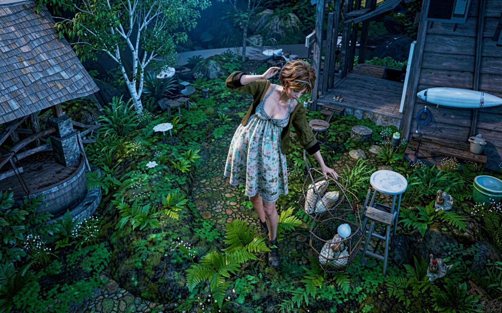 Изображение отличается детальной проработкой текстур ткани платья и органических элементов растительности. Мягкое естественное освещение создает плавные переходы теней на каменной дорожке, а градиенты фона подчеркивают глубину пространства между деревянными постройками и густой зеленью папоротников. На сайте доступен удобный предпросмотр перед загрузкой для оценки качества отображения всех элементов сцены на вашем экране.