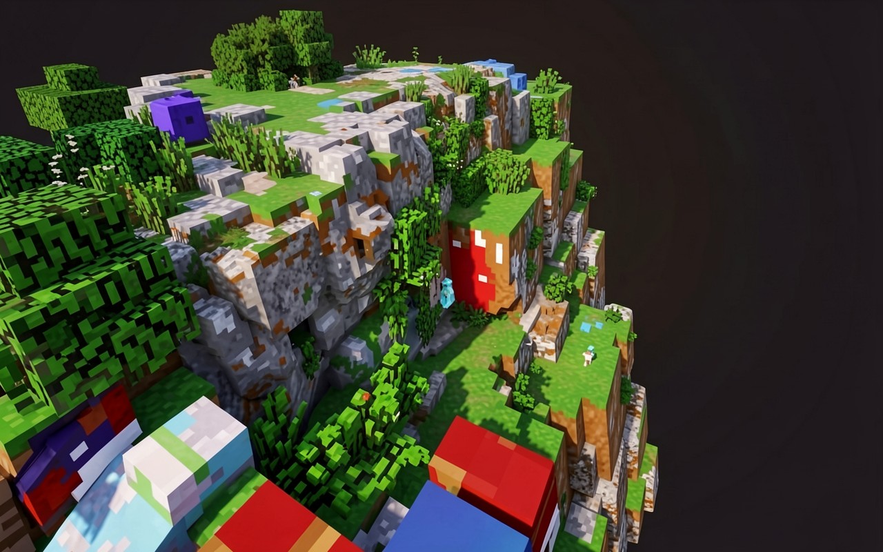 Композиция базируется на контрасте серого камня, ярко-зеленой травы и глубокого темного фона, что создает эффект объема. Технически изображение выполнено с применением глобального освещения и мягких теней, имитирующих современные шейдеры для рендеринга вокселей. Согласно данным nvidia.com, технологии трассировки лучей позволяют достичь подобного уровня фотореализма в блочных мирах за счет точного расчета отражений света от каждой грани куба.