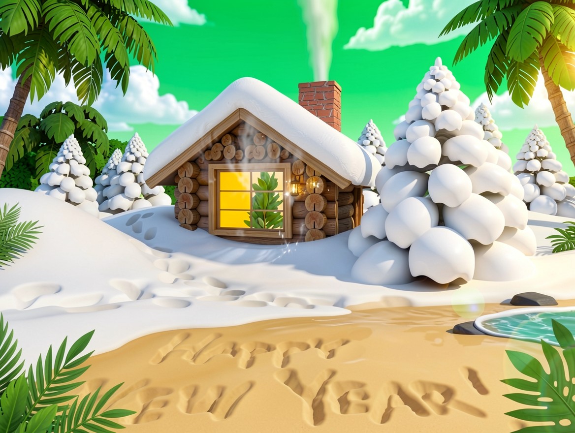 Изображение детально передает текстуру грубого дерева бревенчатого дома и мягкость снежного покрова на крыше. Освещение создает контраст между теплым желтым светом из окна и холодными белыми тонами заснеженных елей. Градиенты зеленого неба плавно переходят в светлые оттенки облаков, а песок на переднем плане имеет выраженный рельеф надписи. На сайте доступен удобный предпросмотр перед скачиванием для оценки качества на экране.
