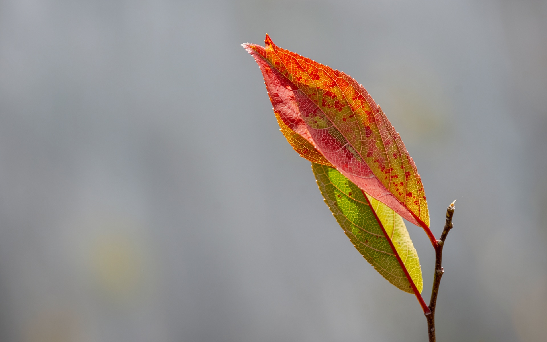 Изображение детально передает структуру листовой пластины, подчеркивая тонкие прожилки и градиент перехода от насыщенного красного к желто-зеленому оттенку. Мягкое освещение создает естественные блики на поверхности, а нейтральный серый фон обеспечивает высокий контраст, выделяя объект. На сайте доступен удобный предпросмотр перед скачиванием для оценки качества отображения на экране.