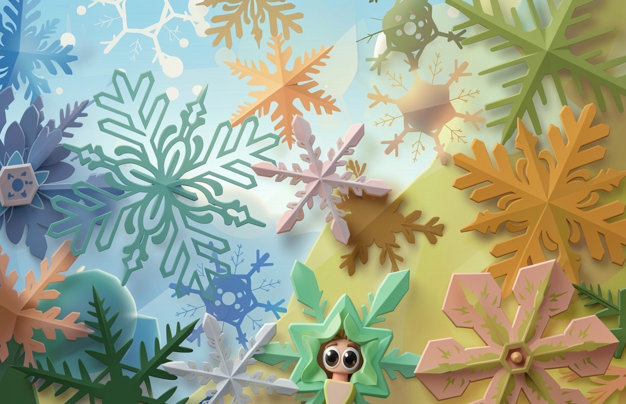 На нашем сайте вы можете скачать обои Разноцветные бумажные снежинки в стиле 3D коллажа в JPG для ПК или телефона – и вот почему: полная цветопередача сохраняется без потери качества.
