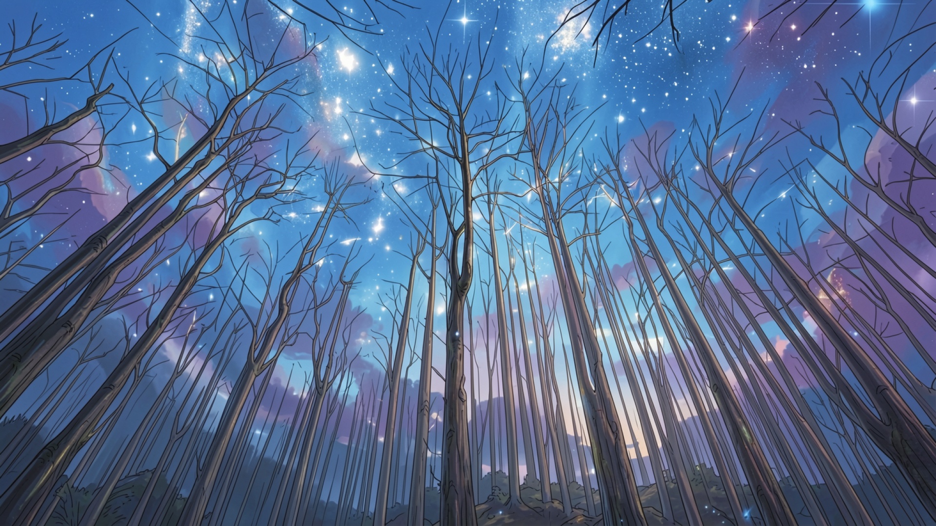 Техническое исполнение работы акцентирует внимание на вертикальных линиях стволов деревьев и контрасте между темной корой и светящимся горизонтом. Градиенты неба переходят от глубокого синего к мягким фиолетовым оттенкам, создавая эффект объемного пространства. Освещение имитирует естественный звездный свет с четкими бликами на ветвях и плавными тенями в нижней части композиции. На сайте предусмотрен удобный предпросмотр перед загрузкой для оценки качества отображения на вашем экране.