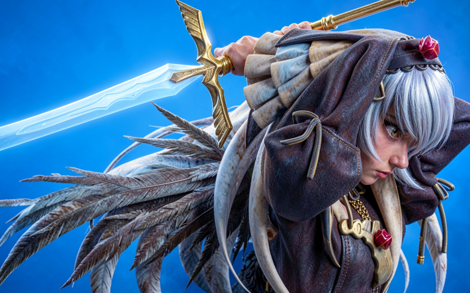 Изображение отличается детальной проработкой текстуры кожи на одежде и четкостью каждого пера в крыльях. Контрастное освещение создает выраженные блики на золотой гарде меча и мягкие градиенты на ярко-синем фоне. Световой поток от лезвия формирует холодные акценты на лице персонажа, подчеркивая объем и глубину сцены. На сайте доступен удобный предпросмотр перед скачиванием для оценки качества на экране.