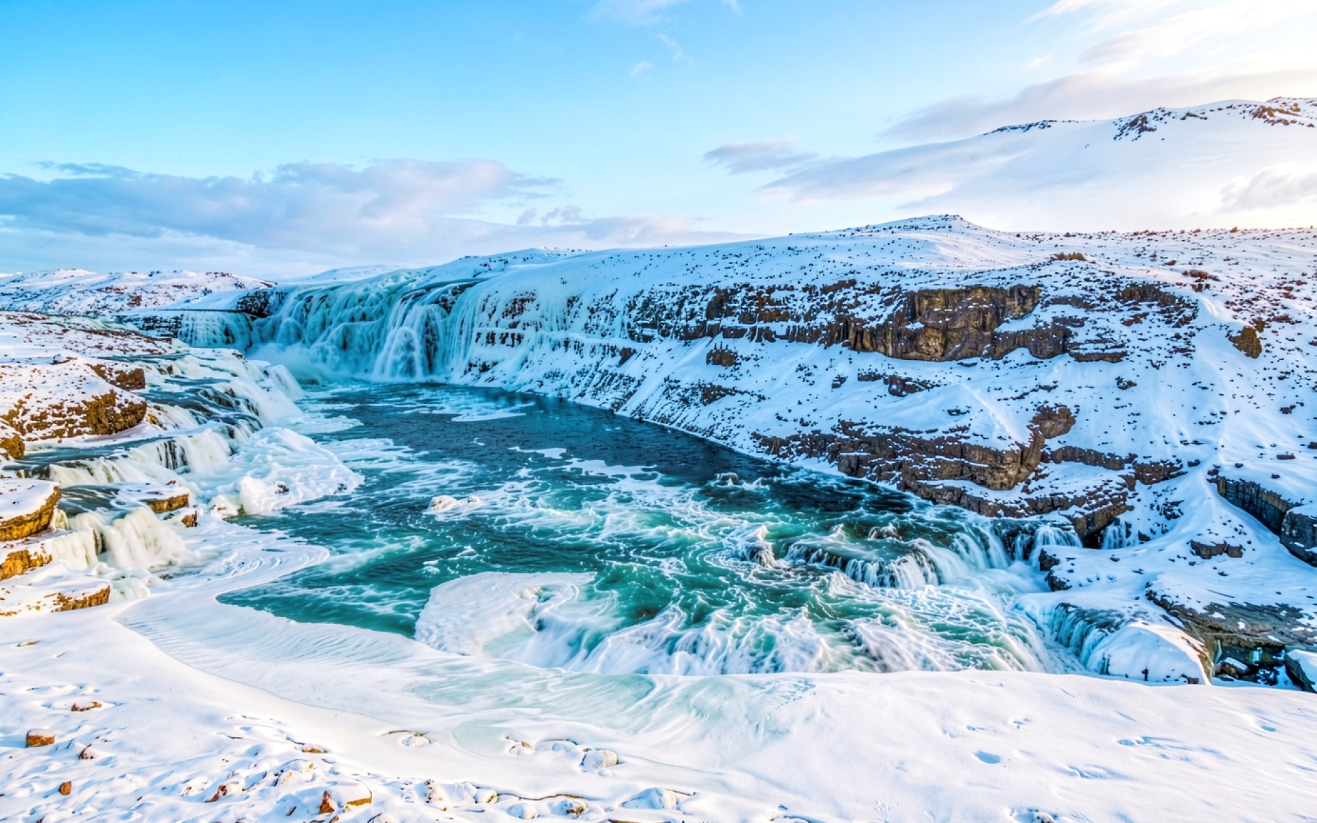 Изображение детально передает текстуру замерзшей пены и динамику потоков воды. Освещение подчеркивает контраст между ярко-белым снегом и глубоким бирюзовым оттенком водной глади. Мягкие тени в расщелинах скал создают объем, а плавные переходы цвета в небе дополняют общую композицию. На сайте доступен удобный предпросмотр перед загрузкой для оценки качества на экране.