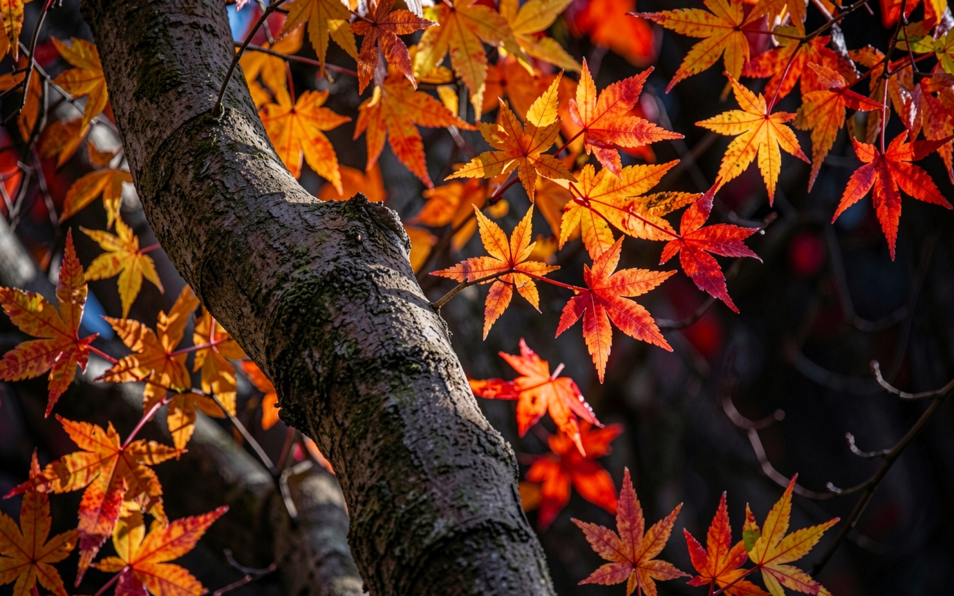 Техническое исполнение кадра акцентирует внимание на контрасте между шероховатой текстурой коры дерева и гладкой поверхностью листовых пластин. Освещение создает выраженные блики на гранях листьев, подчеркивая их насыщенный красный пигмент, в то время как глубокие тени в глубине кроны создают объем. Градиенты фона плавно переходят от темных участков к ярким вспышкам света. На сайте доступен удобный предпросмотр перед скачиванием, чтобы оценить качество отображения на вашем экране.