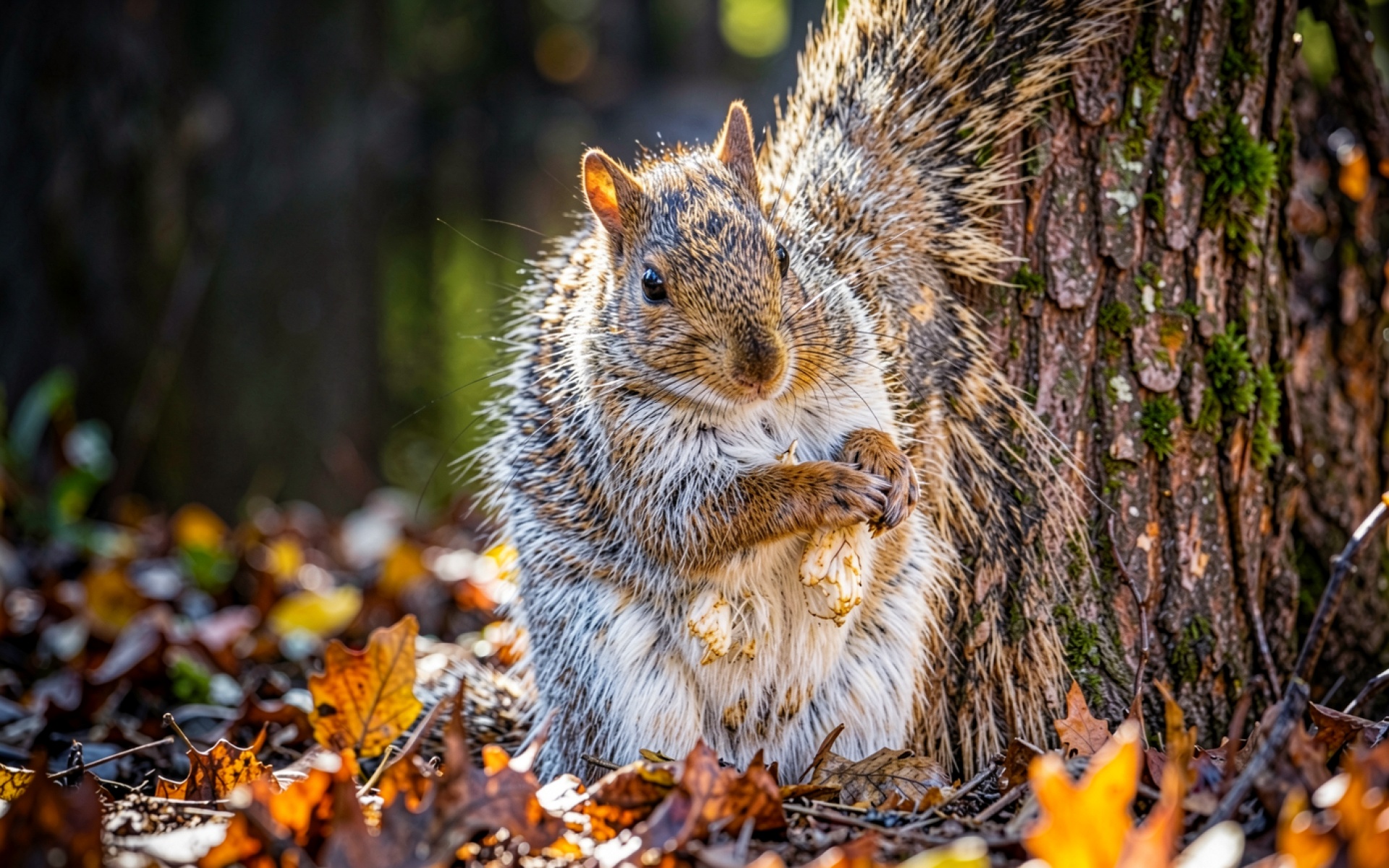 Техническое исполнение кадра подчеркивает детальную текстуру шерсти грызуна и шероховатость коры дерева. Освещение создает мягкие блики на контурах хвоста, а глубокие тени в нижней части композиции добавляют объема. Градиенты фона плавно переходят от темных стволов к золотистым пятнам листвы. Сайт предлагает удобный предпросмотр перед загрузкой для оценки качества отображения на вашем экране.
