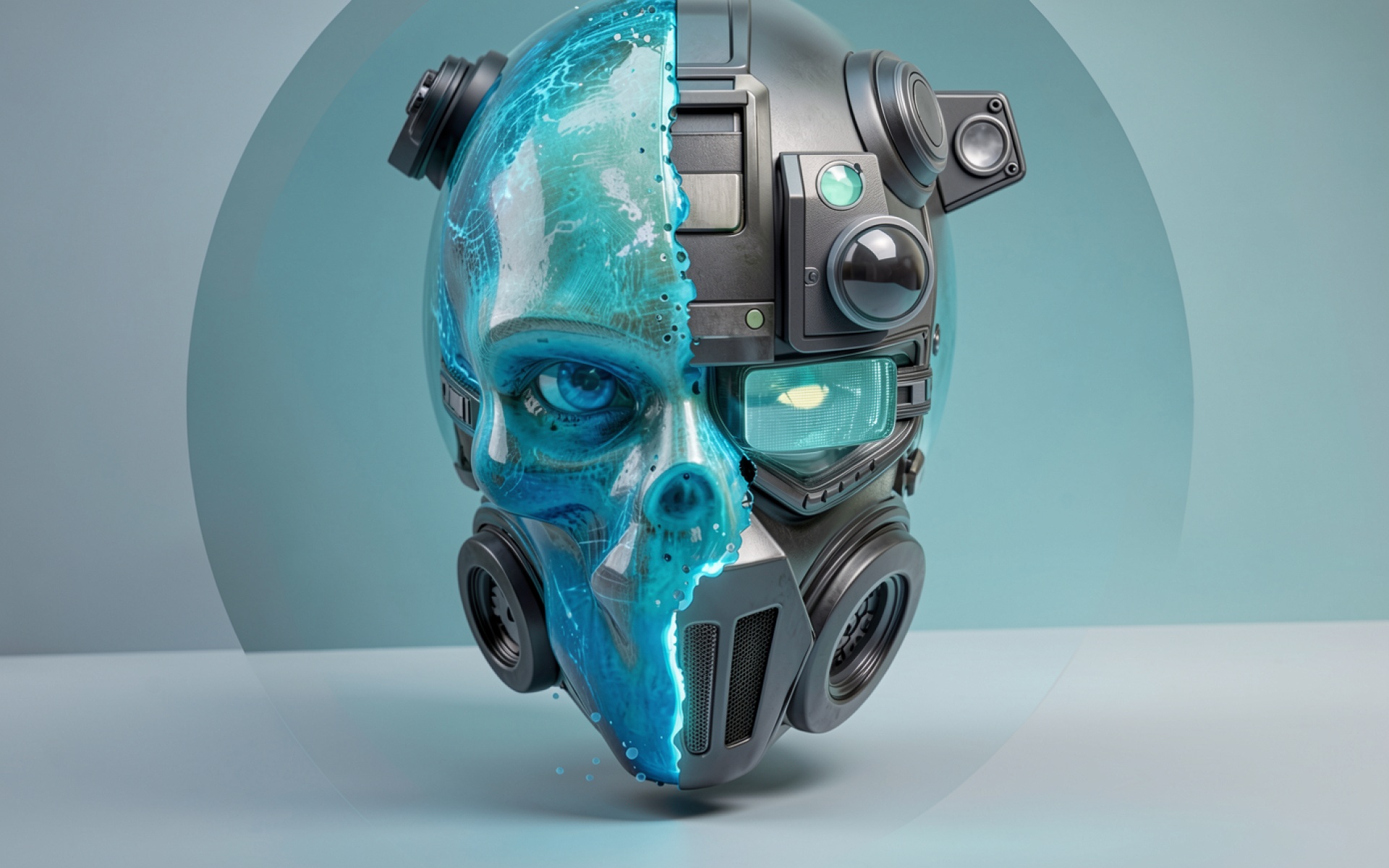 Изображение демонстрирует контраст между матовыми темными поверхностями металла и полупрозрачной светящейся структурой лица. Особое внимание уделено детализации микросхем, бликам на стеклянных линзах и плавным градиентам голубого света в тенях. Освещение создает объемный эффект за счет четких акцентов на гранях шлема и мягкого рассеивания неонового сияния на заднем плане. На сайте доступен удобный предпросмотр перед скачиванием для оценки качества на экране.