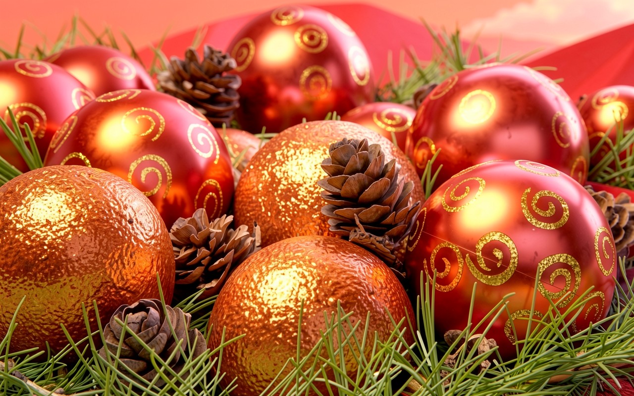 Техническое исполнение кадра акцентирует внимание на контрасте глянцевых поверхностей красных сфер и зернистой текстуры золотых элементов. Освещение создает четкие блики на стекле и глубокие тени в переплетениях сосновых игл, а мягкий градиент фона подчеркивает объем композиции. Сайт предоставляет удобный предпросмотр перед загрузкой, чтобы оценить качество отображения цветов на вашем экране.