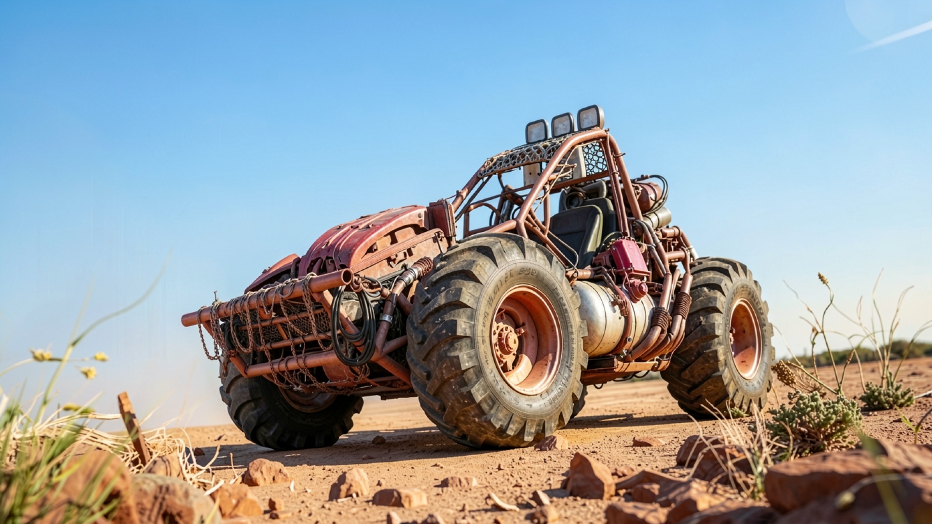 Изображение детально передает текстуру окисленного металла и шероховатость массивных протекторов шин. Освещение имитирует жесткий полуденный свет, создавая глубокие контрастные тени под днищем машины и яркие блики на металлических трубках каркаса. Градиент чистого голубого неба плавно переходит в охристые тона песчаной почвы с разбросанными камнями. На сайте предусмотрен удобный предпросмотр перед загрузкой, чтобы оценить качество отображения всех элементов на вашем экране.
