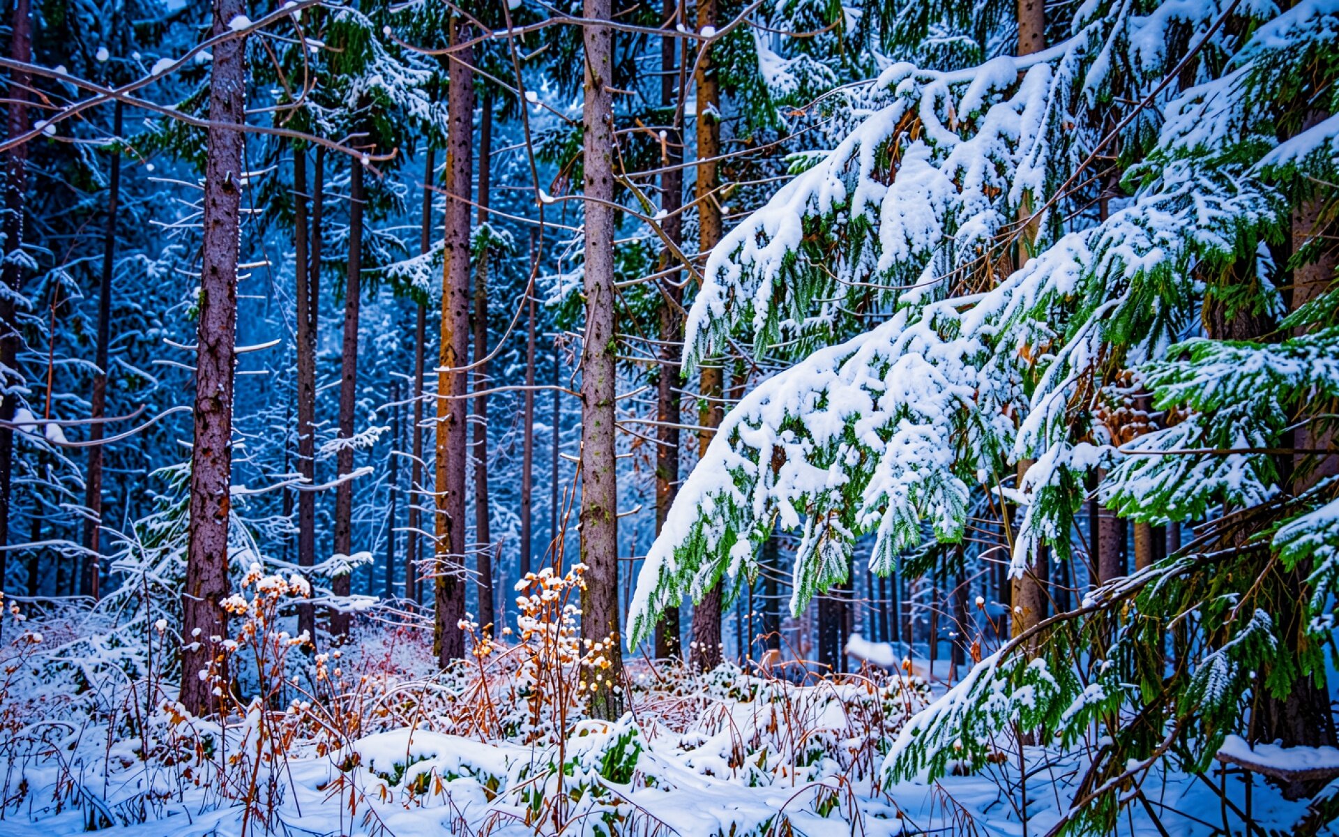 Изображение детально передает текстуру свежевыпавшего снега на ветвях елей и грубую кору стволов. Контраст между холодными синими градиентами заднего плана и теплыми охристыми оттенками сухой травы создает объемную композицию. Мягкое рассеянное освещение подчеркивает блики на снежных шапках, а глубокие тени в глубине чащи добавляют сцене атмосферности. На сайте доступен удобный предпросмотр перед скачиванием для оценки качества на экране.