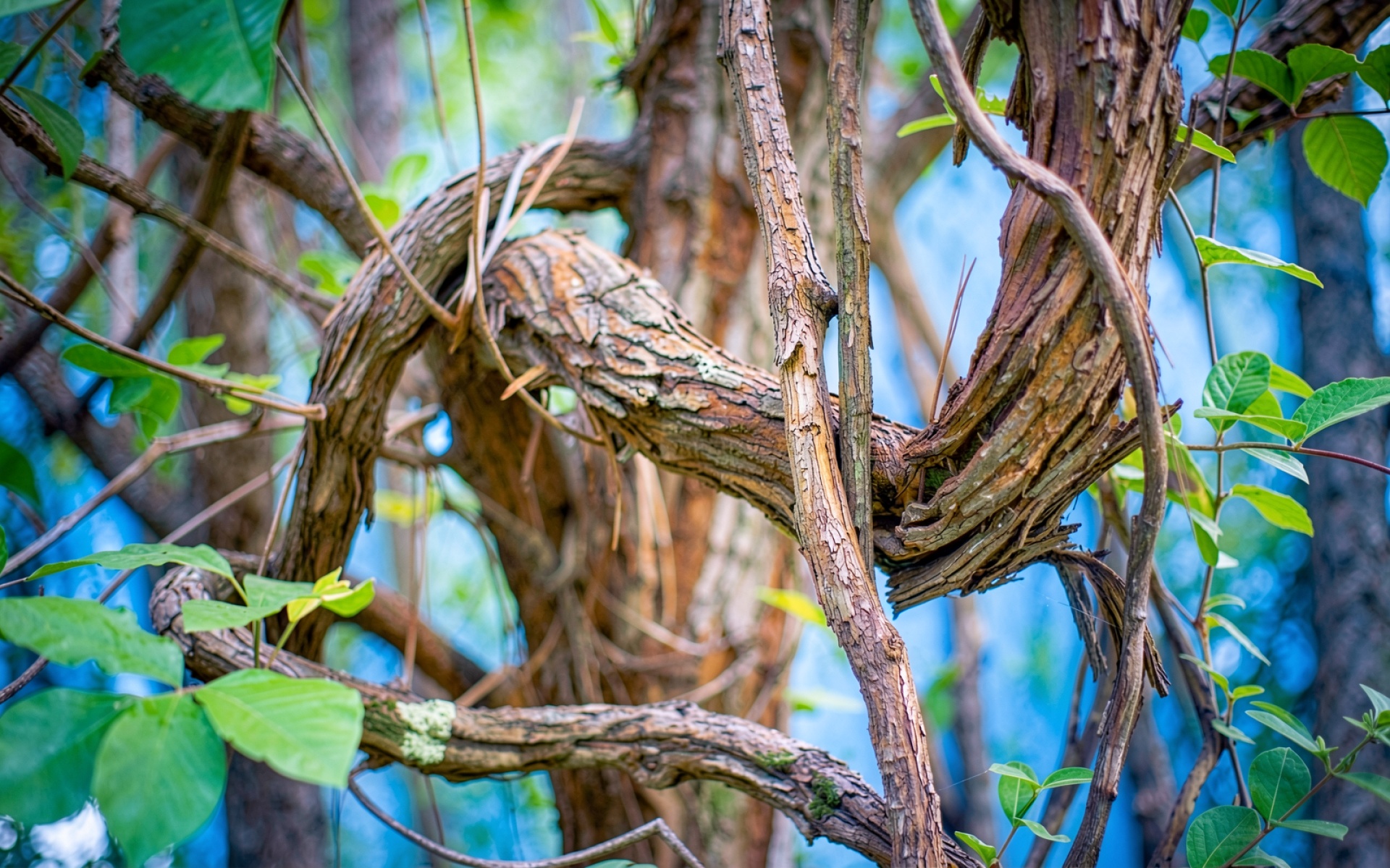 Снимок демонстрирует сложную структуру лиан и древесных наростов с высокой четкостью каждой трещины. Цветовая палитра базируется на контрасте теплых охристых оттенков коры и холодных сине-зеленых тонов заднего плана. Согласно данным britannica.com, подобные формы переплетения часто встречаются у тропических растений и лиан в процессе борьбы за доступ к солнечному свету. Технически изображение характеризуется высокой плотностью пикселей и правильным балансом белого, что исключает необходимость дополнительной цветокоррекции при установке на экран.