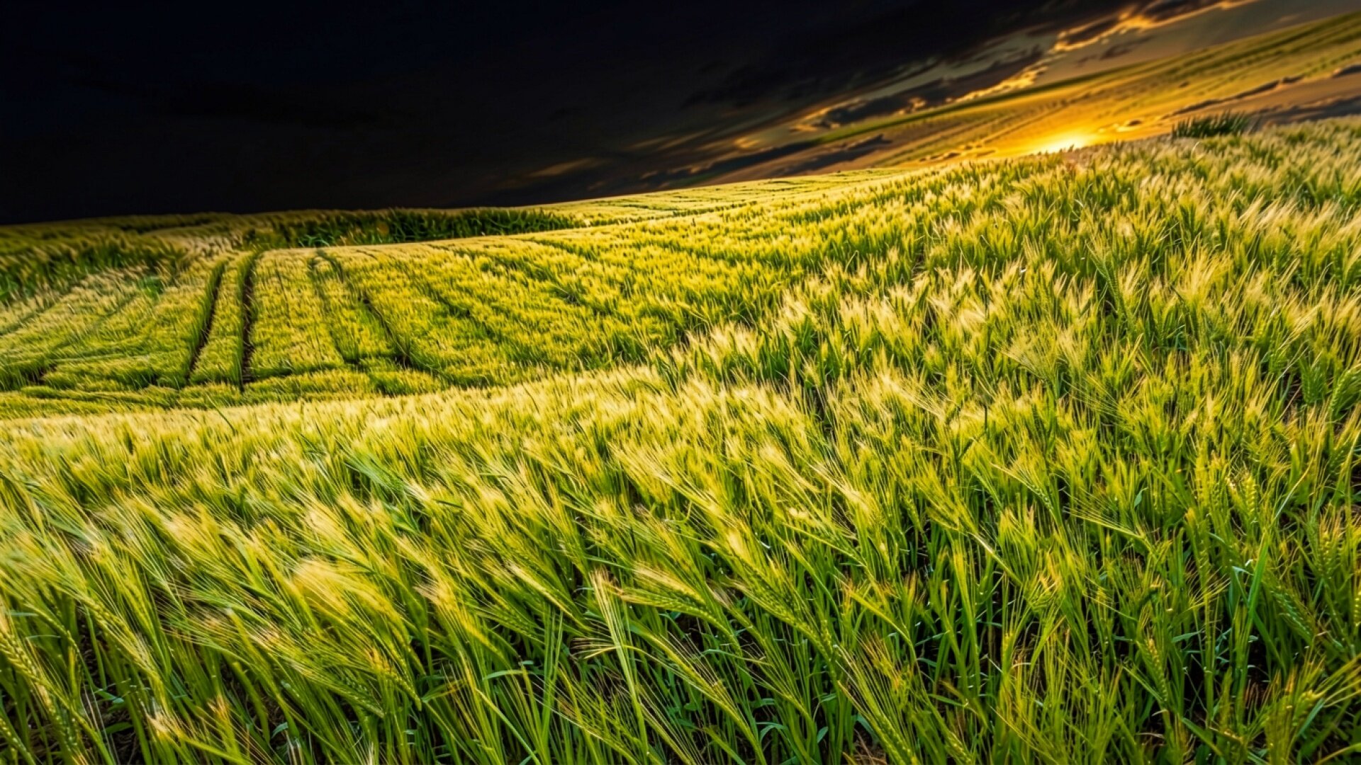 Техническое исполнение кадра подчеркивает контраст между светящимися колосьями и глубокими тенями грозового неба. Текстура зерновых культур передана четко, видны отдельные ворсинки и изгибы стеблей под воздействием ветра. Градиент перехода от ярко-желтого горизонта к почти черному зениту создает драматический объем. На сайте доступен удобный предпросмотр перед скачиванием, чтобы оценить качество отображения на вашем экране.