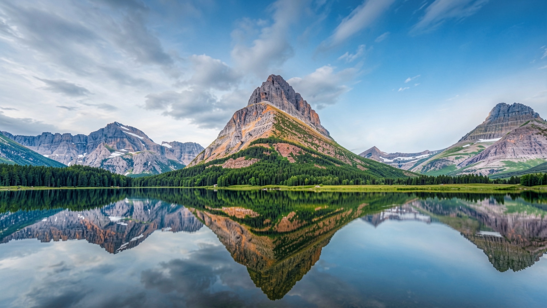 Изображение характеризуется четкой детализацией скальных пород и плавными градиентами голубого неба. Освещение подчеркивает рельеф вершин, создавая контрастные тени в расщелинах и яркие блики на освещенных склонах. Текстура хвойного леса у подножия гор передана с высокой точностью, а зеркальная поверхность воды создает симметричную композицию. На сайте доступен удобный предпросмотр перед скачиванием для оценки качества на экране.