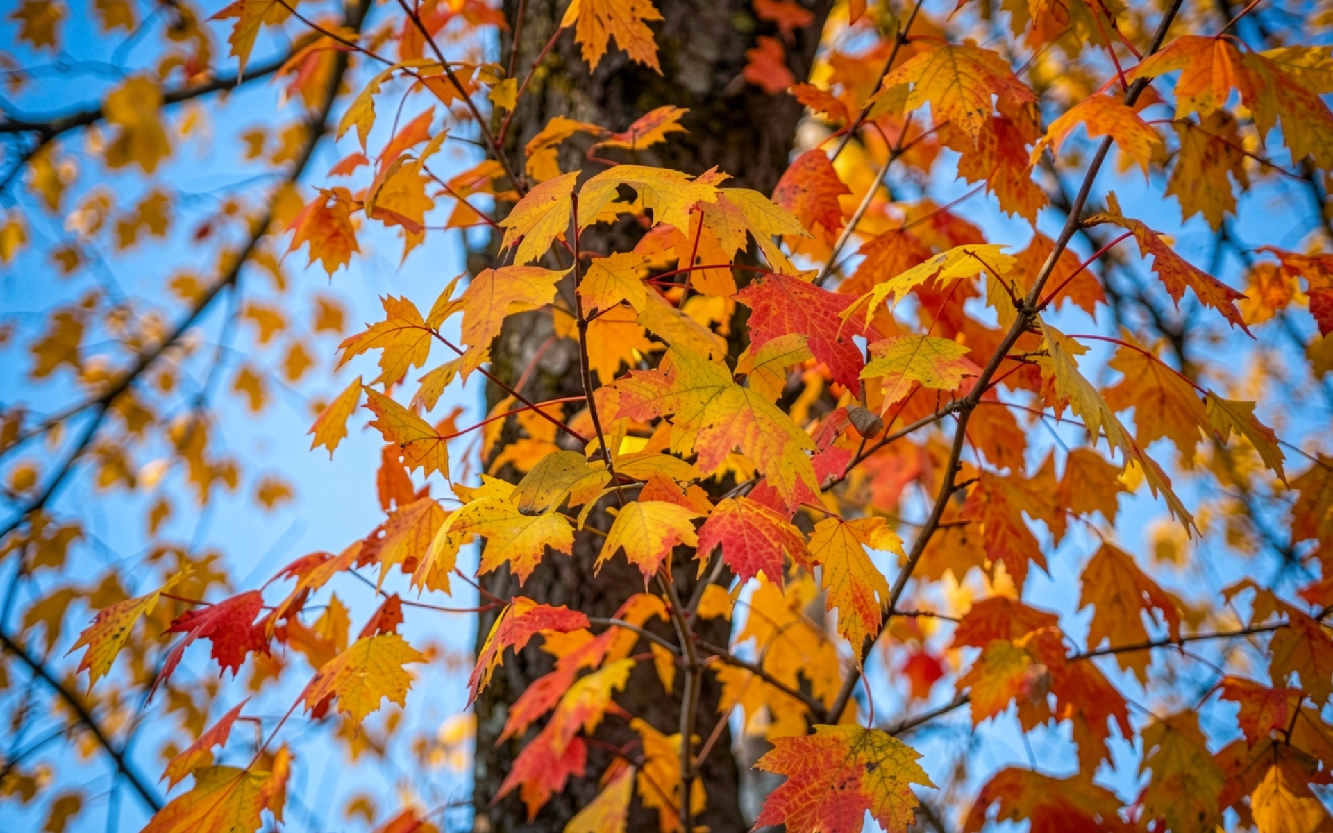 Изображение детально передает текстуру прожилок каждого листа и шероховатость коры дерева. Контрастное освещение создает четкие блики на глянцевых поверхностях листвы, а мягкие градиенты синего неба на заднем плане подчеркивают насыщенность теплых тонов. На сайте доступен удобный предпросмотр перед скачиванием для оценки качества на экране.