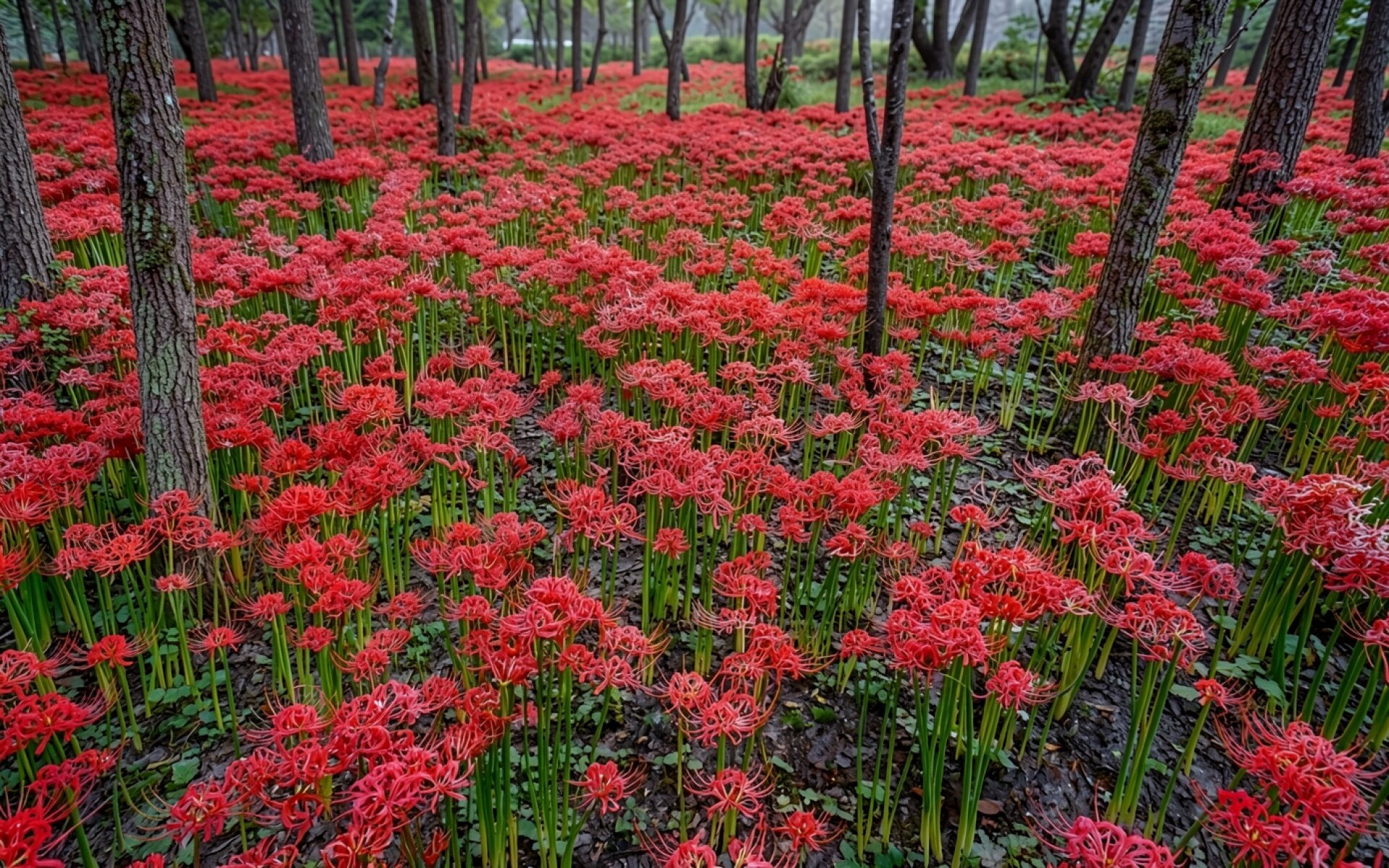 Красные цветы ликорис в темном лесу обои