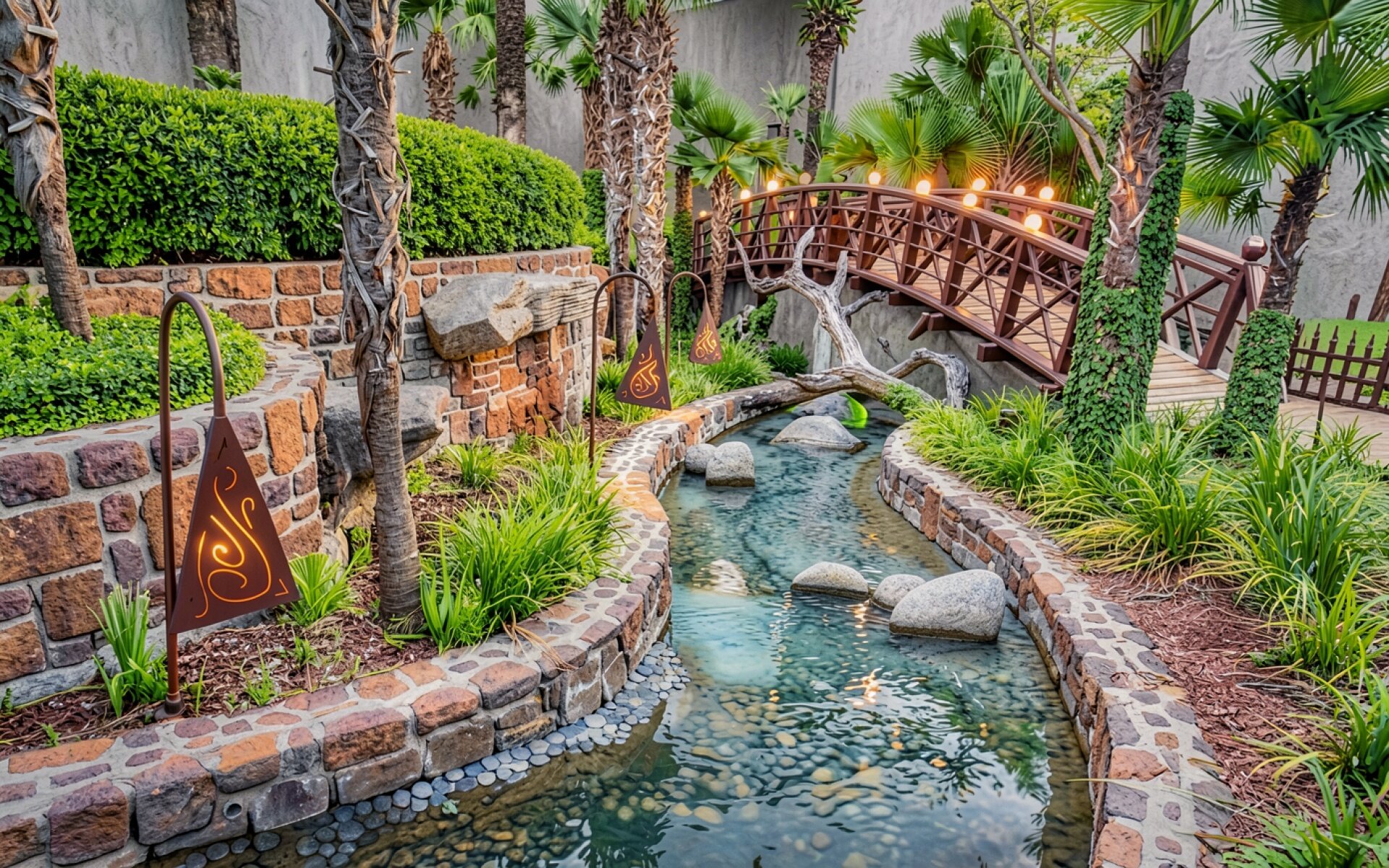 Изображение детально передает текстуру натурального камня в отделке берегов и волокна темного дерева в конструкции моста. Мягкое освещение от фонарей создает теплые блики на поверхности воды, которые контрастируют с глубокими тенями в густой зелени тропических растений. Плавные градиенты серого цвета на заднем плане подчеркивают насыщенность растительности. Сайт предоставляет удобный предпросмотр перед загрузкой для оценки качества на экране.
