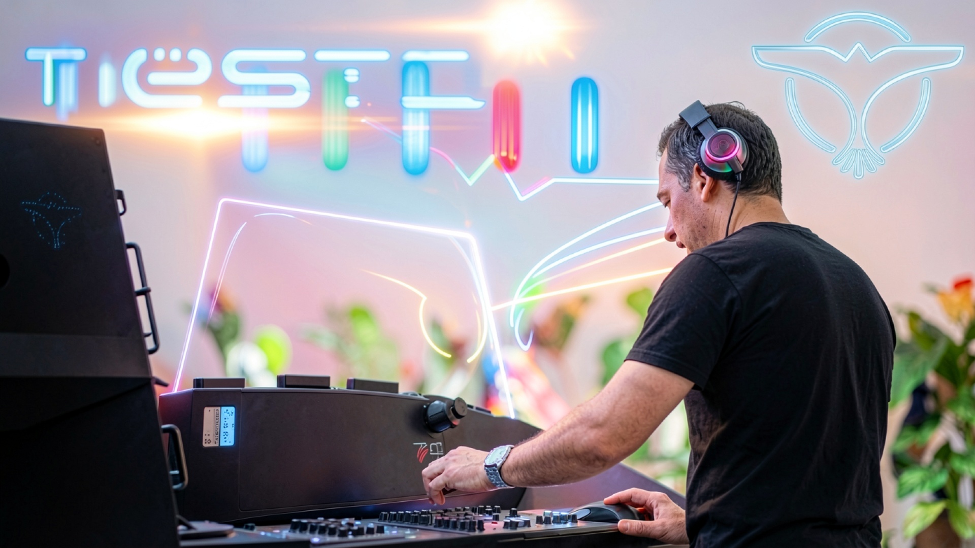 Диджей за пультом в неоновом освещении обои