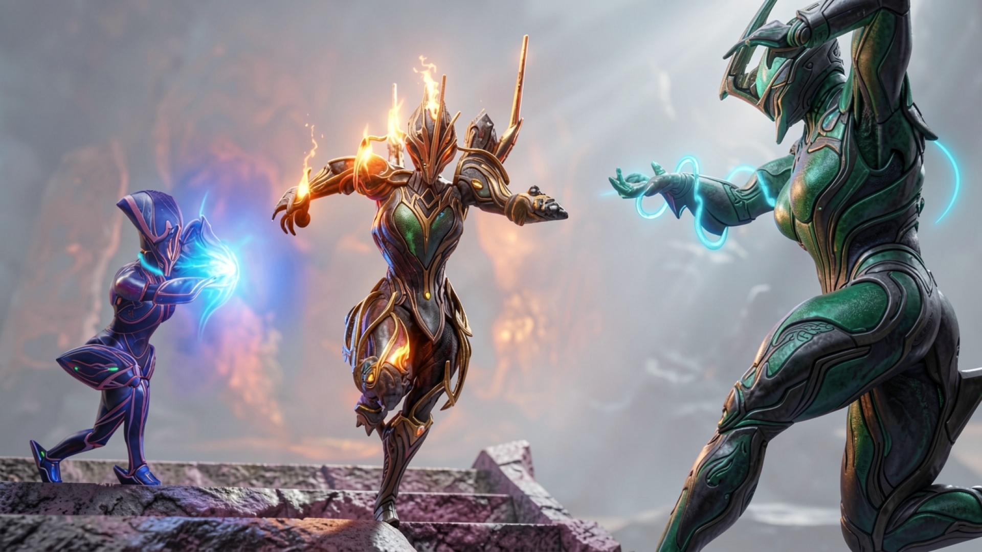 Изображение детально передает текстуры металлических доспехов и неоновое свечение энергетических сфер. Освещение построено на контрасте между холодным синим и теплым золотистым светом, что создает глубокие тени в складках брони и мягкие градиенты на заднем плане. Динамичные блики подчеркивают обтекаемые формы костюмов и детализацию поверхности каменных ступеней. На сайте предусмотрен удобный предпросмотр перед скачиванием для оценки качества на экране.