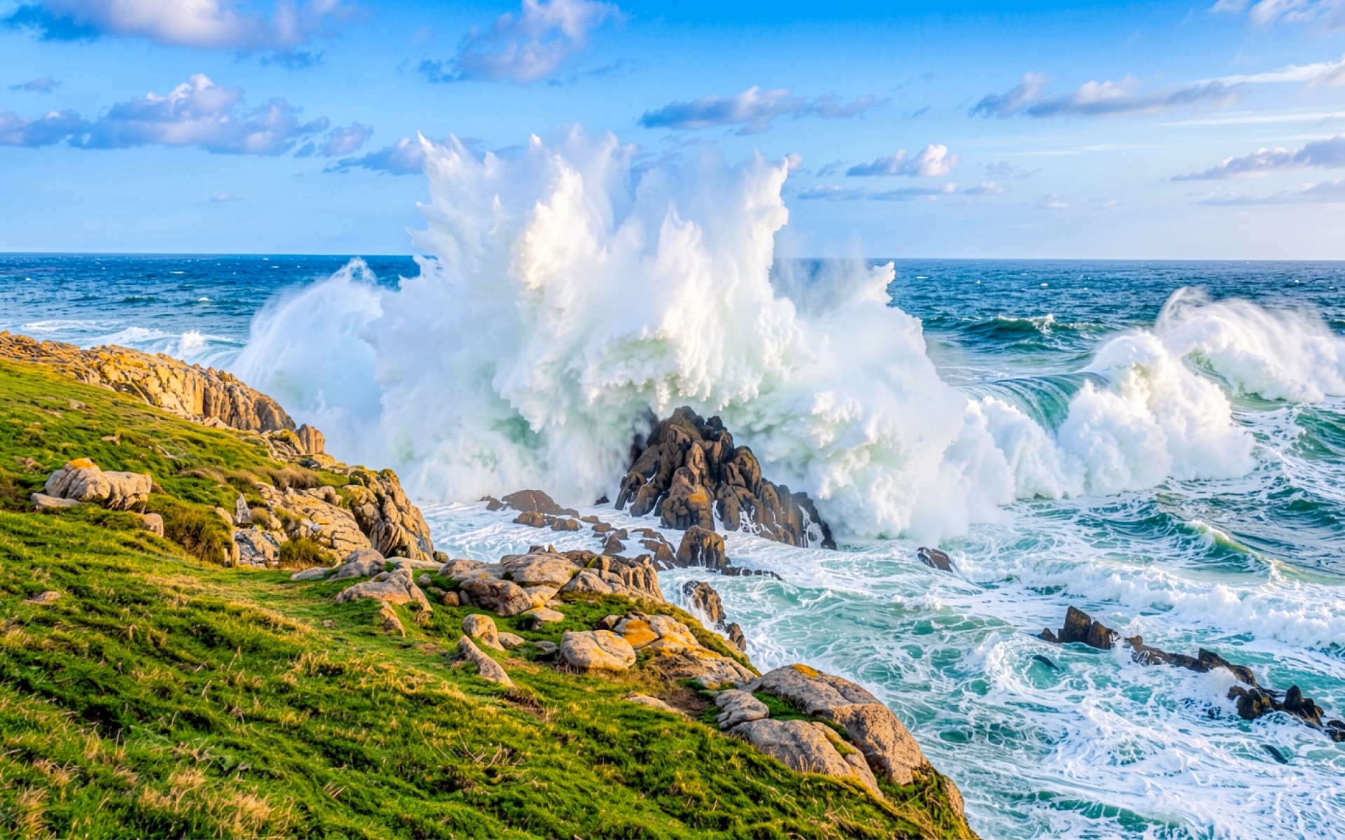 Изображение детально передает текстуру пены и динамику водных брызг. Освещение подчеркивает контраст между холодными оттенками океана и теплыми тонами прибрежных камней. Градиенты неба плавно переходят от насыщенного синего к светло-голубому, а глубокие тени в расщелинах скал создают объем. На сайте доступен удобный предпросмотр перед загрузкой для оценки качества на экране.