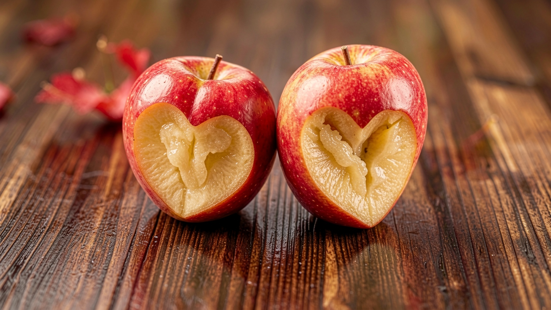 Изображение демонстрирует глянцевую текстуру кожуры плодов с плавными переходами от ярко-красного к желтому. Освещение создает четкие блики на поверхности, подчеркивая объем сердцеобразных вырезов и пористую структуру мякоти внутри. Фон из темного дерева с выраженным направленным рисунком волокон дополняет композицию глубокими градиентами. На сайте доступен удобный предпросмотр перед скачиванием для оценки качества на экране.