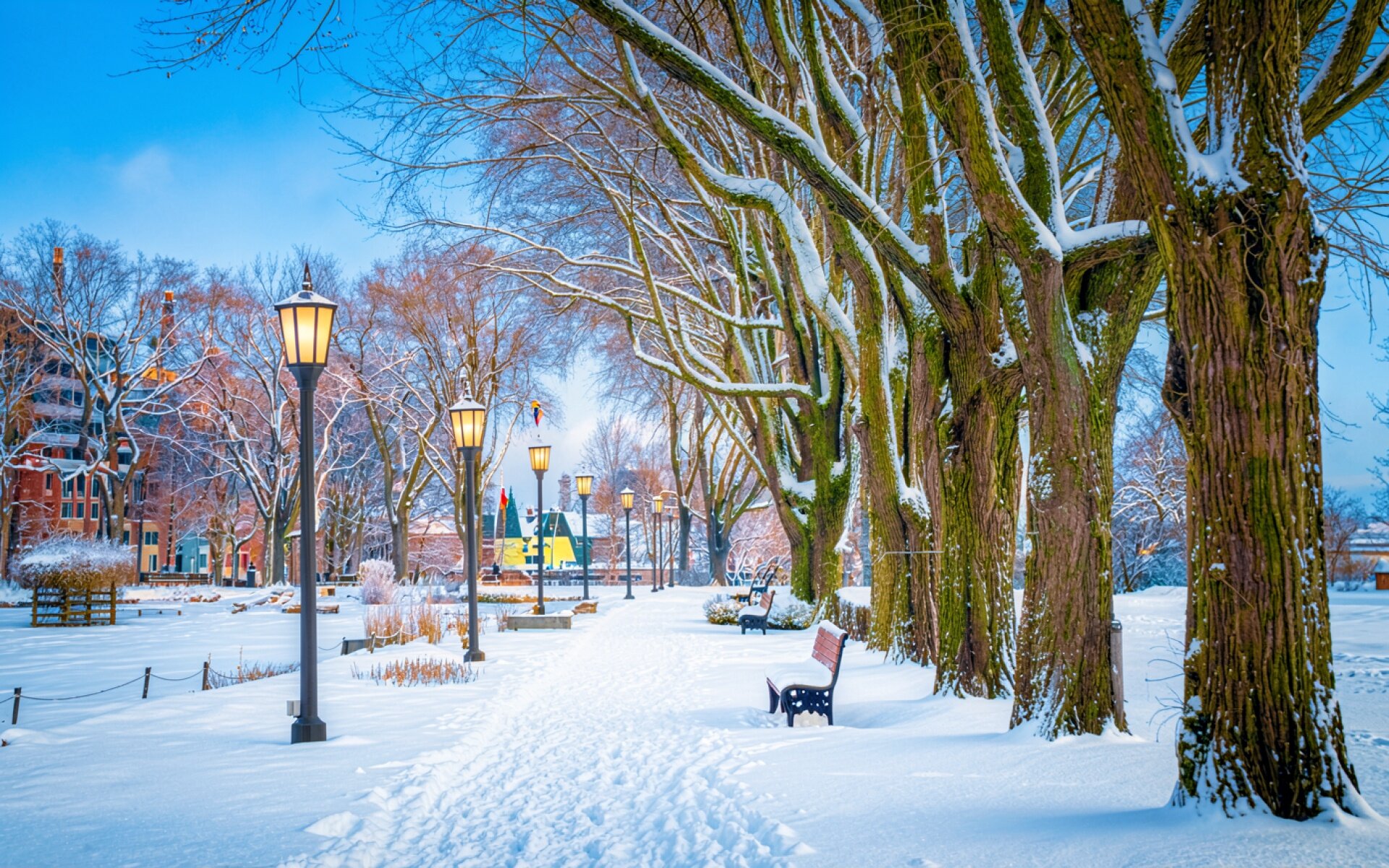Техническое исполнение кадра акцентирует внимание на контрасте между белым снегом и темной корой деревьев. Текстура заснеженных ветвей передана четко, а мягкие градиенты голубого неба создают естественное освещение. Теплые блики от уличных фонарей формируют глубокие тени на поверхности сугробов, добавляя сцене объем. На сайте доступен удобный предпросмотр перед загрузкой, чтобы оценить качество отображения на вашем экране.