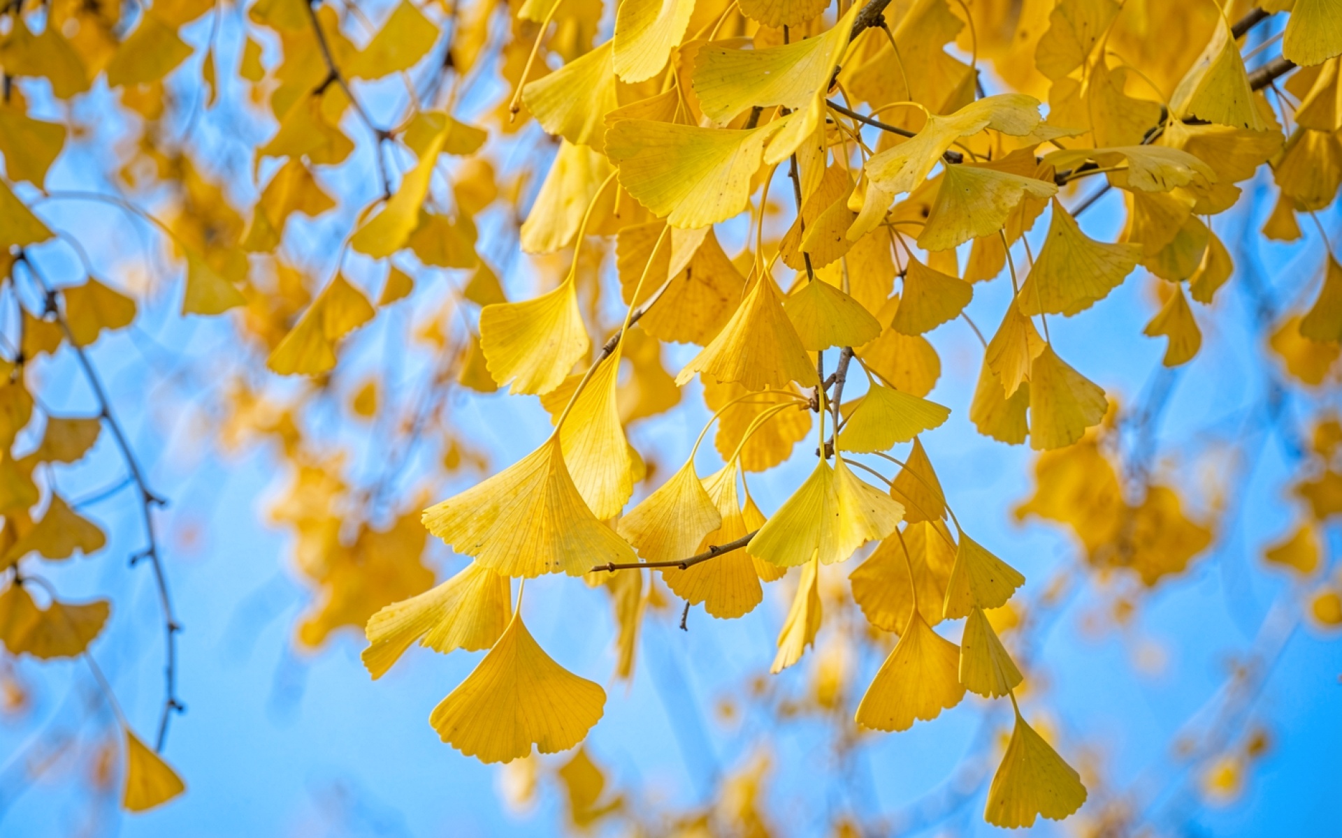 Скачайте JPG файл обоев Желтые листья гинкго на голубом фоне на нашем сайте – и вот почему: они подходят для профессионального редактирования без артефактов.