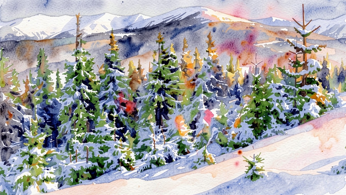 Изображение отличается мягкими переходами акварельных пятен, где текстура бумаги подчеркивает легкость снежного покрова. Освещение имитирует холодный зимний день с теплыми бликами на верхушках елей, создавая контраст между глубокими синими тенями и светлыми участками фона. Градиенты неба плавно перетекают из бледно-голубого в розоватые тона заснеженных гор. На сайте доступен удобный предпросмотр перед загрузкой для оценки качества на экране.