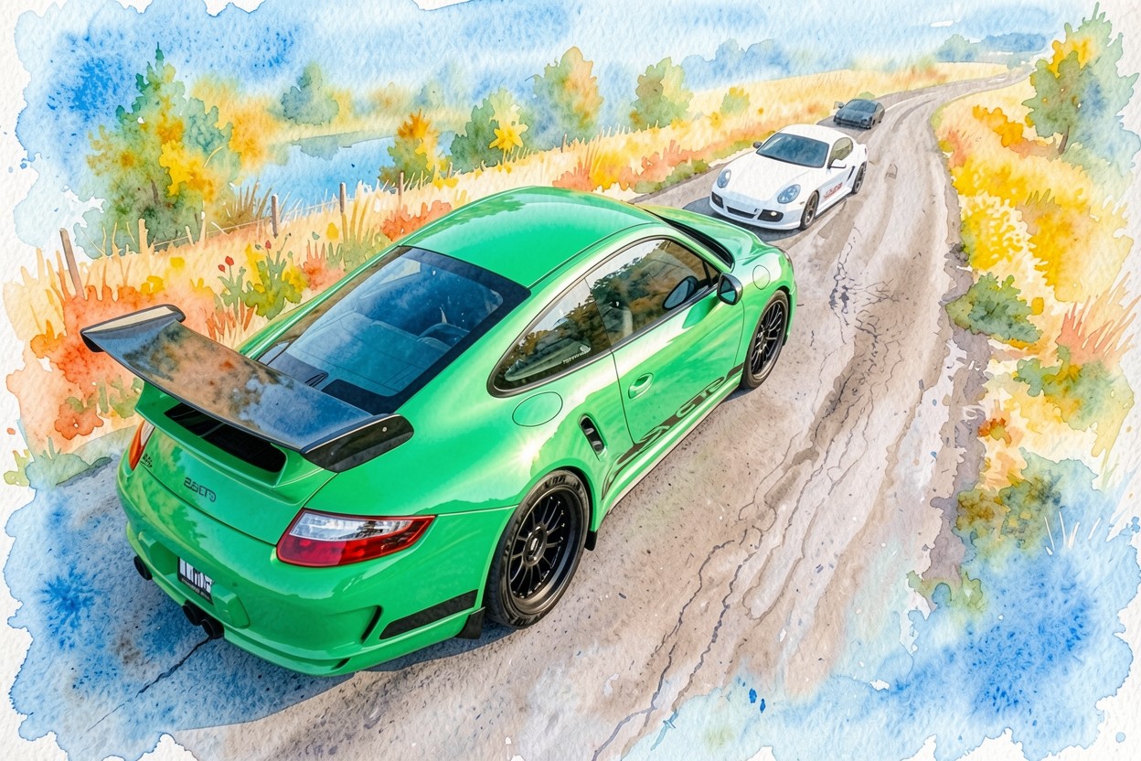 Скачайте JPG файл обоев Зеленый спортивный автомобиль Porsche на загородной дороге на нашем сайте – и вот почему: они подходят для профессионального редактирования без артефактов.