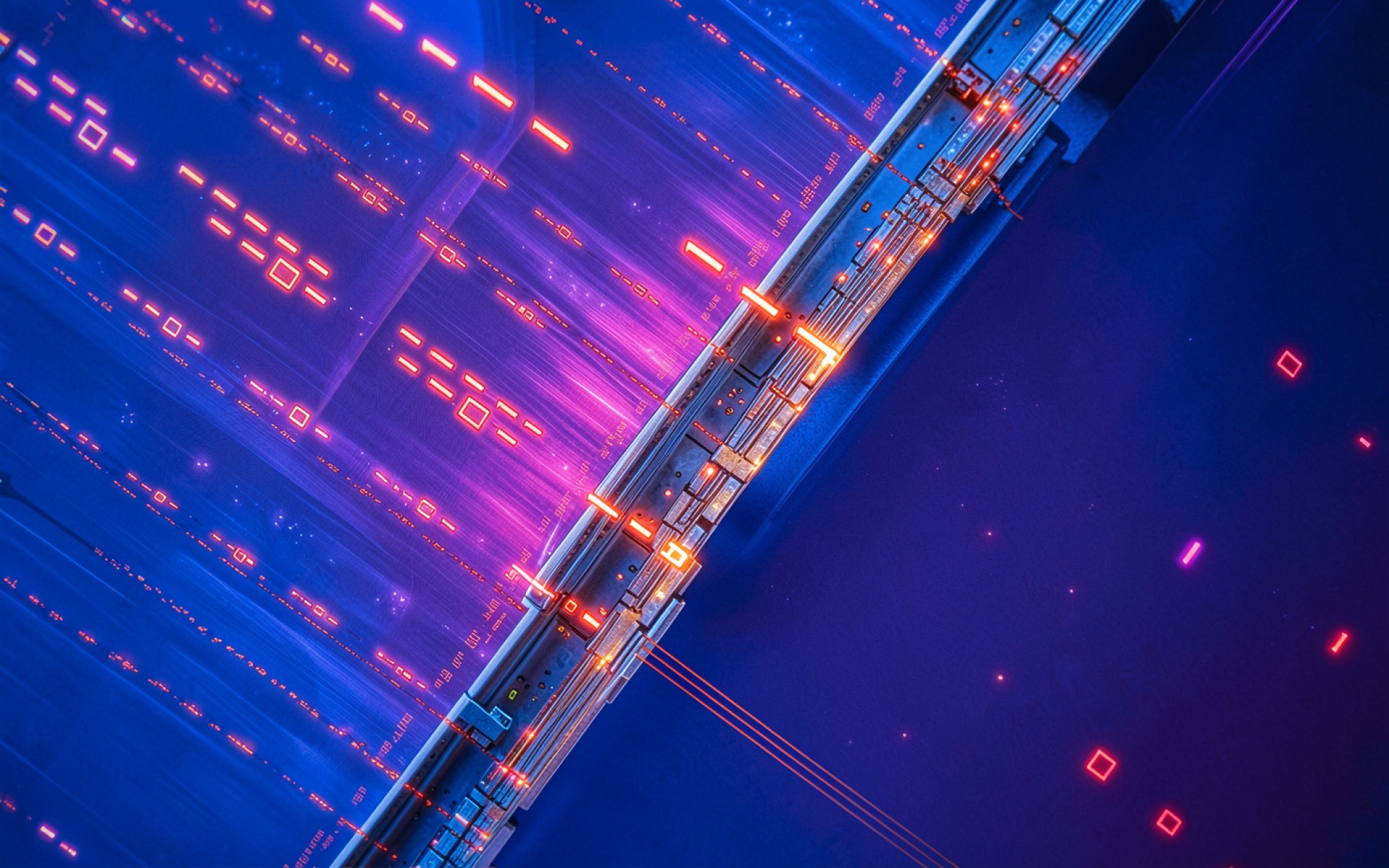 Изображение детально передает геометрию неоновых структур и металлических поверхностей. Особое внимание уделено градиентам глубокого синего цвета, которые контрастируют с ярко-оранжевыми световыми акцентами. Текстуры цифровых панелей и линейные блики создают эффект глубины пространства. На сайте доступен удобный предпросмотр перед скачиванием, чтобы оценить качество отображения на вашем экране.