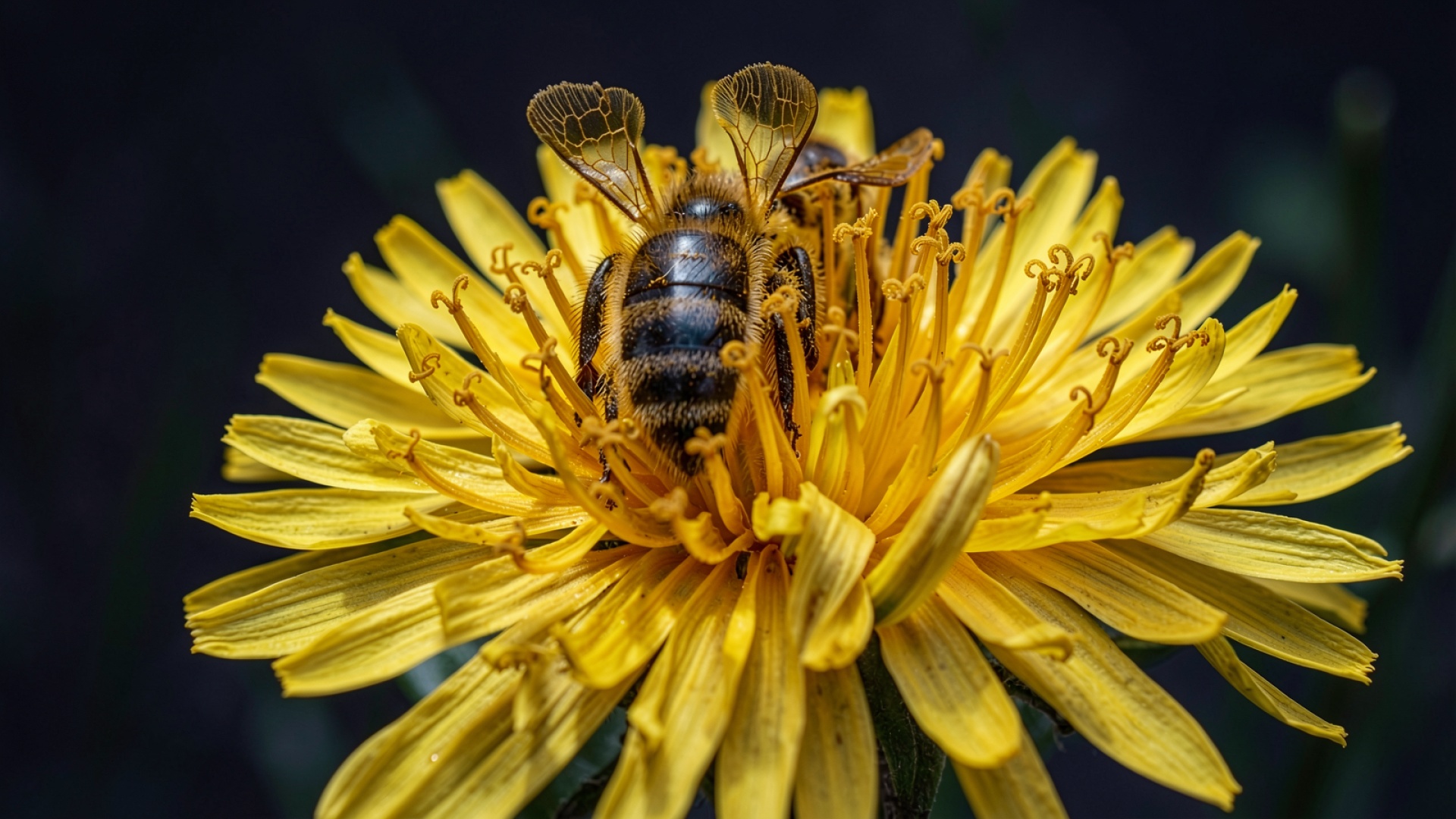 Техническое исполнение снимка характеризуется малой глубиной резкости, которая изолирует объект от темного фона, создавая сильный контраст. Внимание сосредоточено на сегментации брюшка насекомого и структуре лепестков. Согласно данным nationalgeographic.com, пчелы играют ключевую роль в биоразнообразии планеты через процесс опыления. Изображение передает этот биологический процесс через детализацию ворсинок на теле пчелы, которые удерживают частицы пыльцы при перемещении между соцветиями.