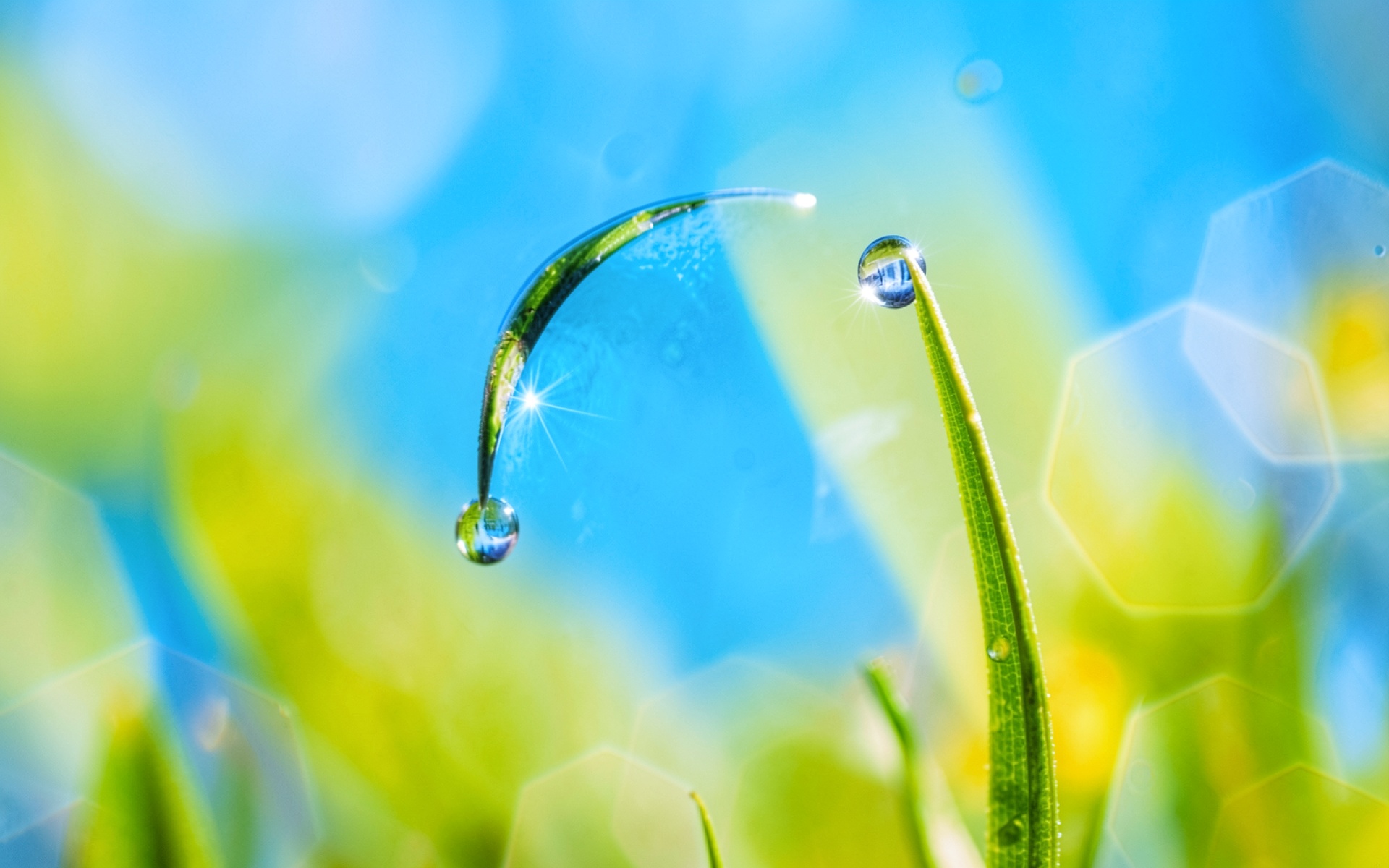 Капли росы на зеленых травинках утром обои