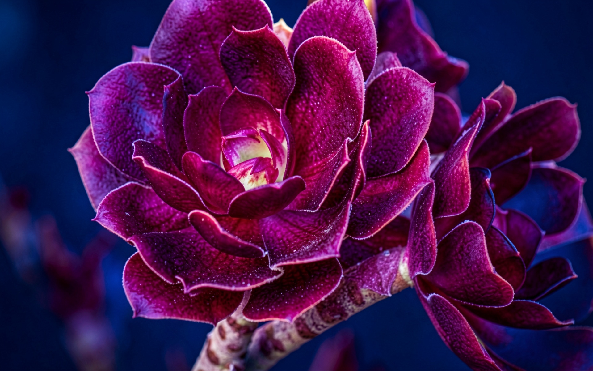 Техническое исполнение кадра подчеркивает бархатистую текстуру лепестков и глубокие винные оттенки растения. Контрастное освещение создает четкие блики на краях листьев и плавные градиенты в тенях, что придает сцене объем. Темный фон минимизирует визуальный шум, фокусируя внимание на центральном объекте. На сайте доступен удобный предпросмотр перед загрузкой для оценки качества отображения на вашем экране.