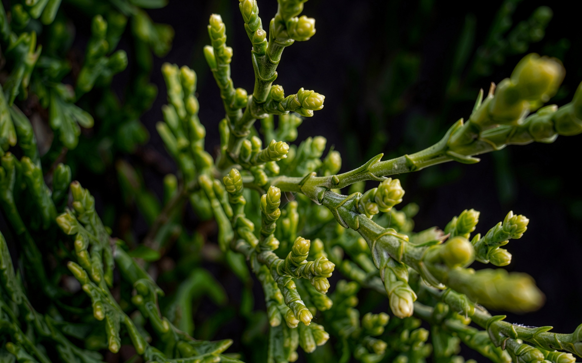 Изображение детально передает текстуру чешуйчатой хвои и глянцевый блеск молодых побегов. Контрастное освещение создает глубокие тени в глубине кроны, подчеркивая объем каждой ветви через четкие блики на кончиках листьев. Плавные градиенты темного фона акцентируют внимание на насыщенном зеленом цвете растения. На сайте доступен удобный предпросмотр перед скачиванием для оценки качества отображения на вашем экране.