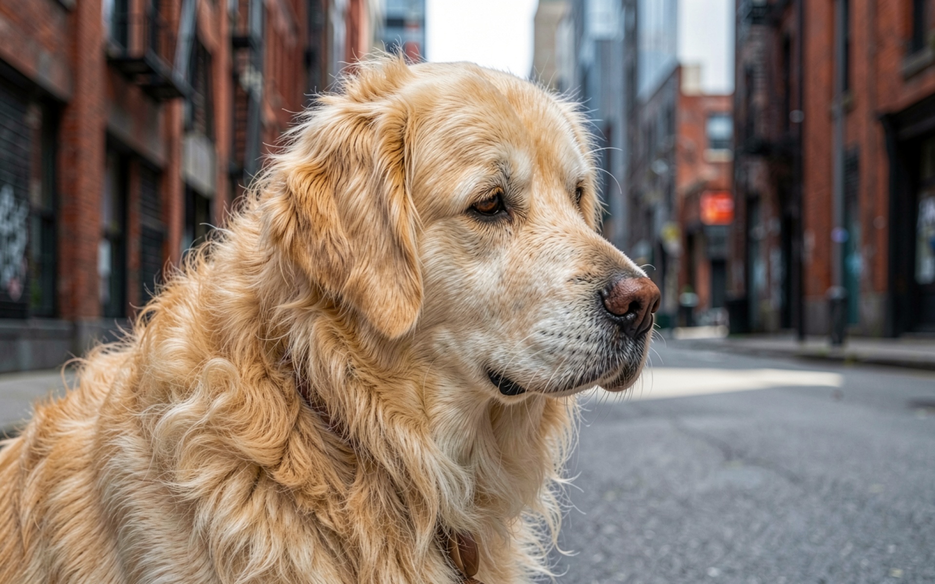 Изображение детально передает структуру густой шерсти собаки с мягкими переходами золотистых оттенков. Освещение в городской локации создает естественные блики на морде и глубокие тени в складках кожи. Фон с кирпичными стенами имеет плавный градиент размытия, что выделяет главный объект. На сайте доступен удобный предпросмотр перед скачиванием для оценки качества на вашем экране.