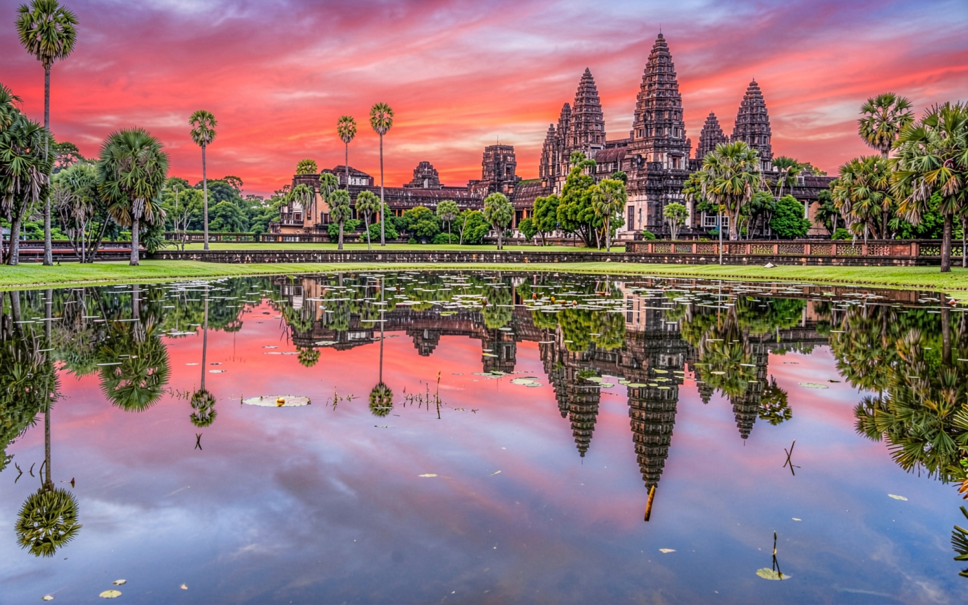 Храм Ангкор-Ват розовый закат отражение в воде обои
