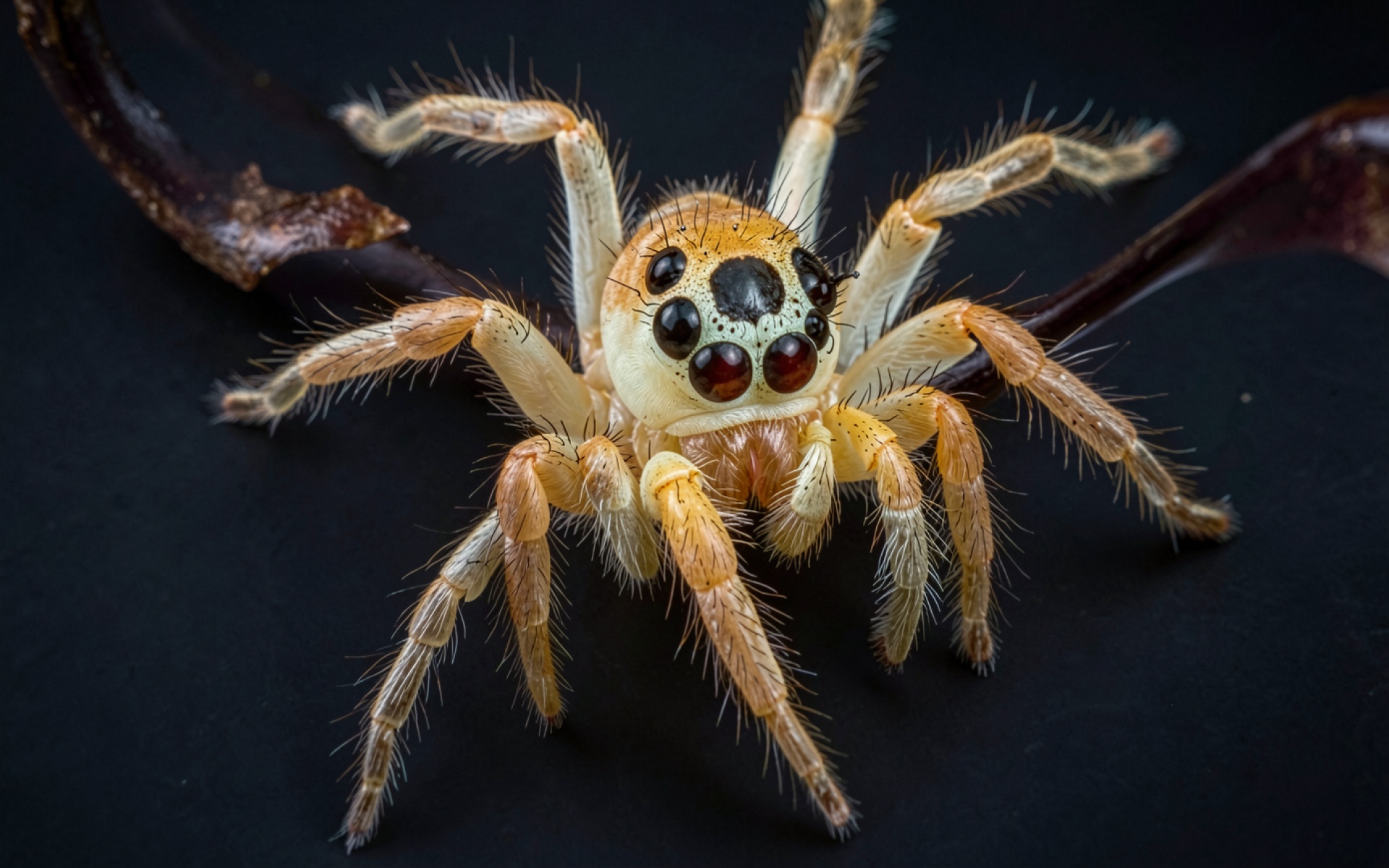 Изображение детально передает текстуру хитинового панциря и мелкие волоски на лапах паука. Контрастное освещение создает четкие блики на фасеточных глазах, а глубокий черный градиент фона подчеркивает насыщенный желтый оттенок тела. Мягкие тени под конечностями добавляют объема всей композиции. На сайте доступен удобный предпросмотр перед загрузкой для оценки качества отображения на вашем экране.