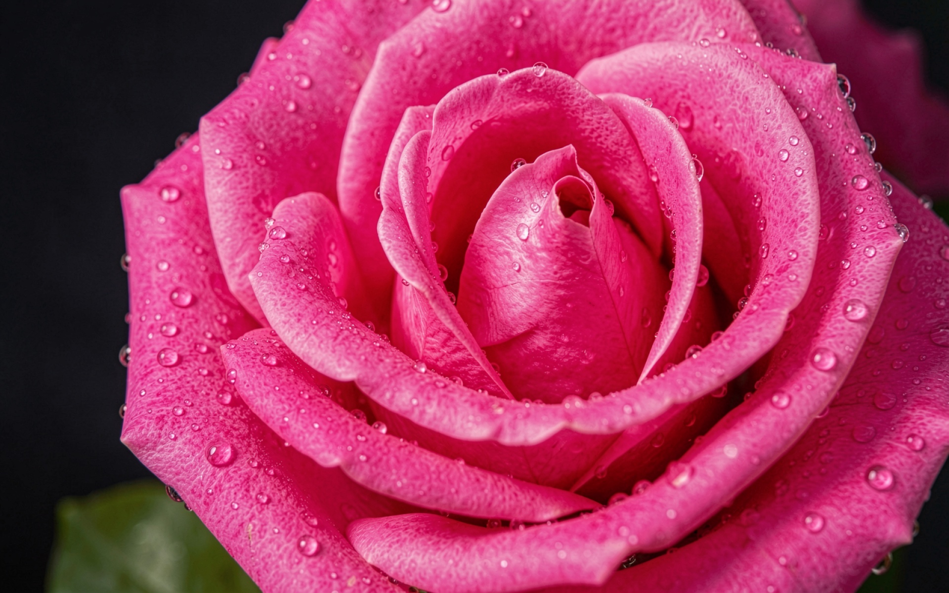 Снимок выполнен в стиле макрофотографии, где основной акцент сделан на спиралевидную структуру бутона и сферические капли воды. Контрастный черный фон усиливает насыщенность розового пигмента, создавая глубокий визуальный объем. Согласно данным botanicalgarden.org, форма лепестков и распределение влаги на поверхности растения зависят от гидрофобных свойств кутикулы листа. Технически изображение характеризуется высокой четкостью границ и отсутствием цифрового шума в темных областях, что позволяет использовать его для печати или в качестве заставки на 4K мониторах.