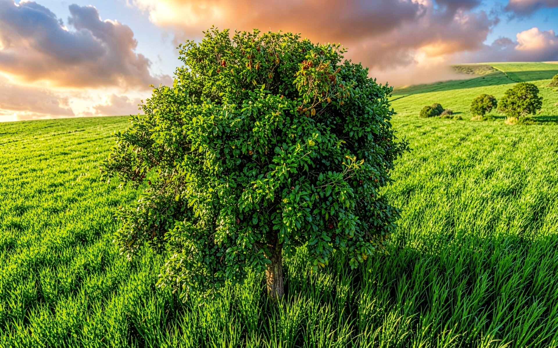 Скачайте это изображение в высоком разрешении, чтобы обновить рабочий стол качественным пейзажем с естественной цветовой гаммой. Картинка представляет собой детальный вид лиственного дерева в центре ярко-зеленого поля под облачным небом во время золотого часа.
