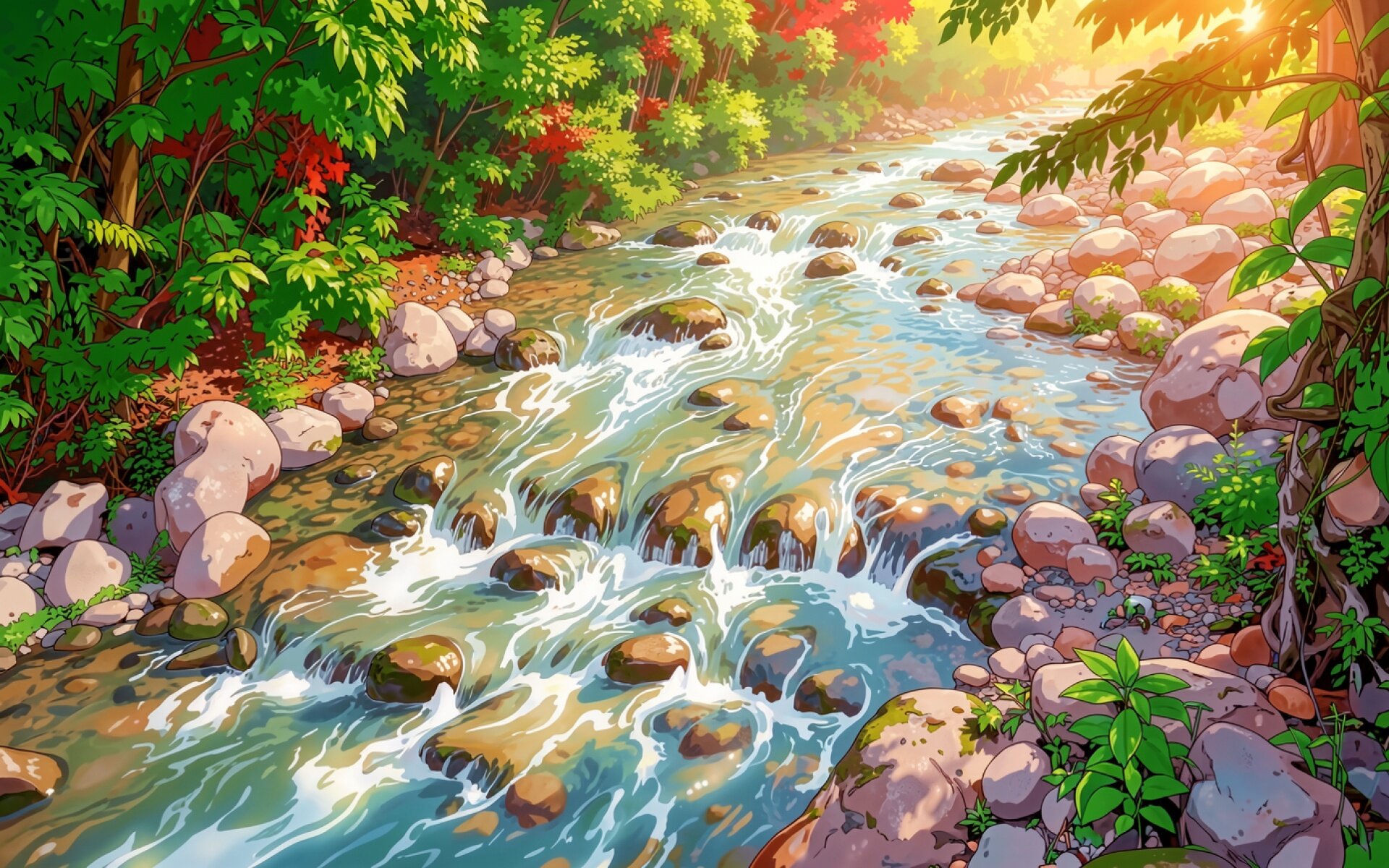 Графическое исполнение подчеркивает динамику потока воды через детальную прорисовку пены и бликов на поверхности камней. Освещение имитирует контровой свет, создавая мягкие градиенты в кронах деревьев и глубокие тени в прибрежной зоне. Текстуры мокрого сланца и гладкой гальки переданы через контрастные переходы света и тени. На сайте доступен удобный предпросмотр перед загрузкой, чтобы оценить качество отображения на вашем экране.