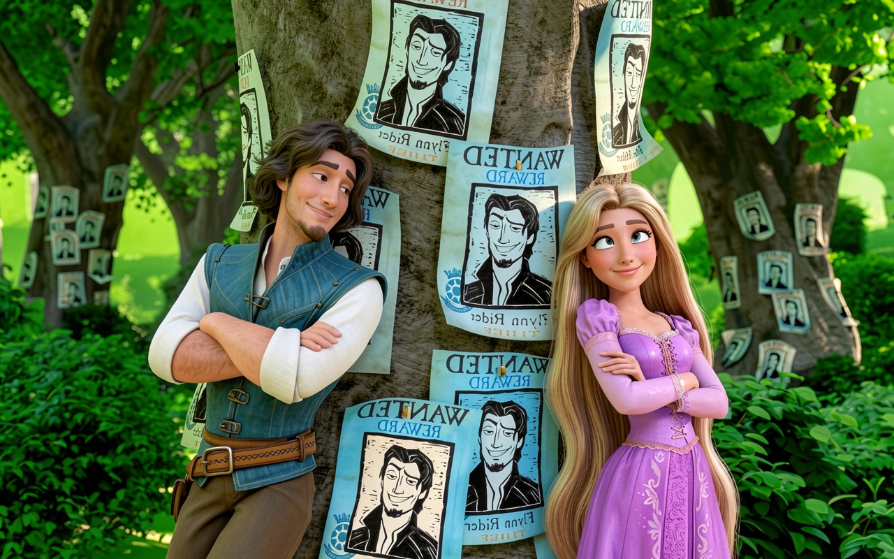 Изображение детально передает текстуру коры старого дерева и матовую поверхность бумаги объявлений. Освещение имитирует мягкий дневной свет, создавая естественные блики на золотистых волосах Рапунцель и глубокие тени в складках одежды персонажей. Плавные переходы зеленого фона подчеркивают глубину лесного массива. Сайт предоставляет удобный предпросмотр перед загрузкой для оценки качества отображения на вашем экране.