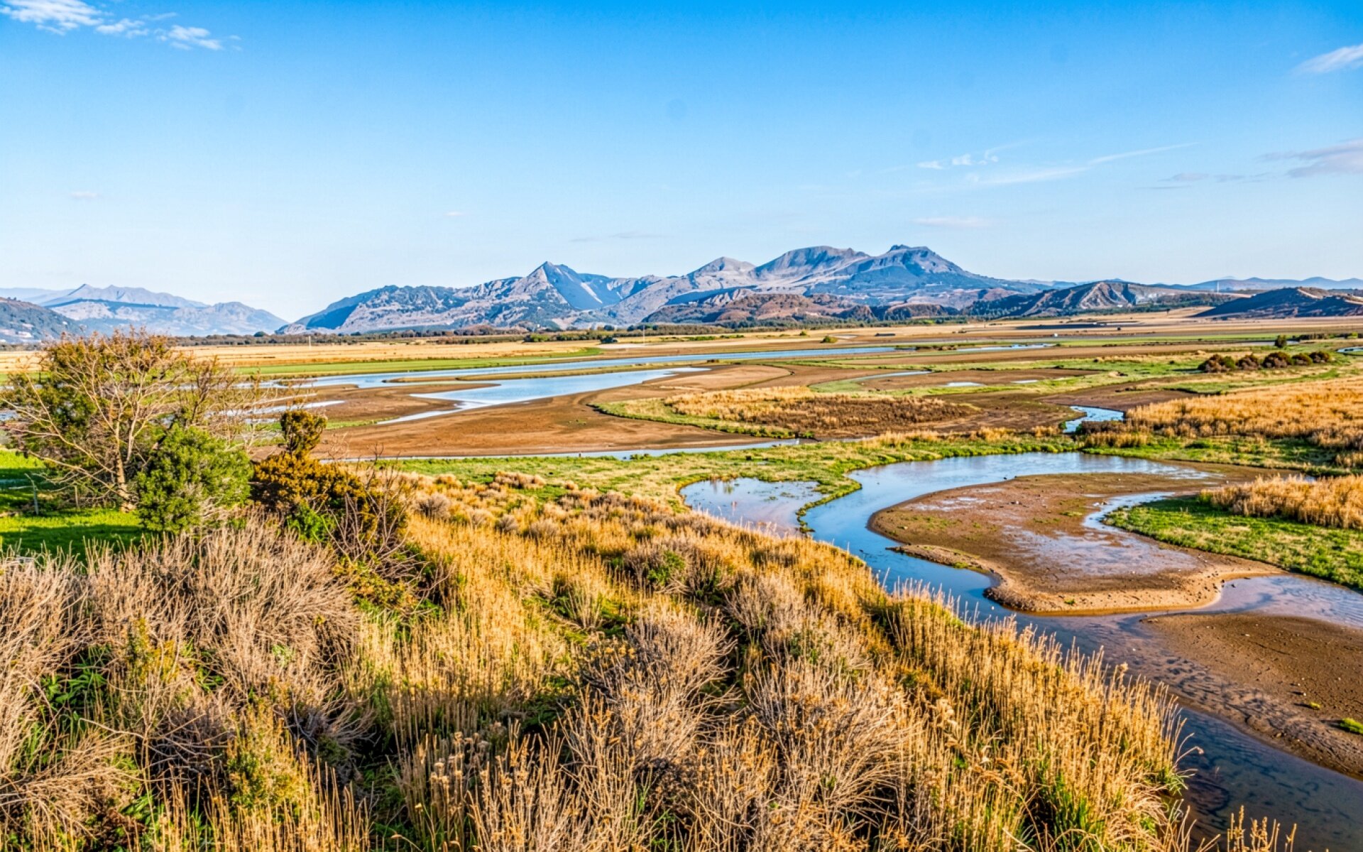 Изображение детально передает текстуру сухой золотистой травы и плавные изгибы водного потока. Освещение имитирует мягкий дневной свет, создавая естественные градиенты на поверхности воды и глубокие тени в складках горных массивов на горизонте. Контраст между синим небом и охристыми оттенками равнины подчеркивает объем сцены. Сайт предоставляет удобный предпросмотр перед загрузкой для оценки качества на экране.