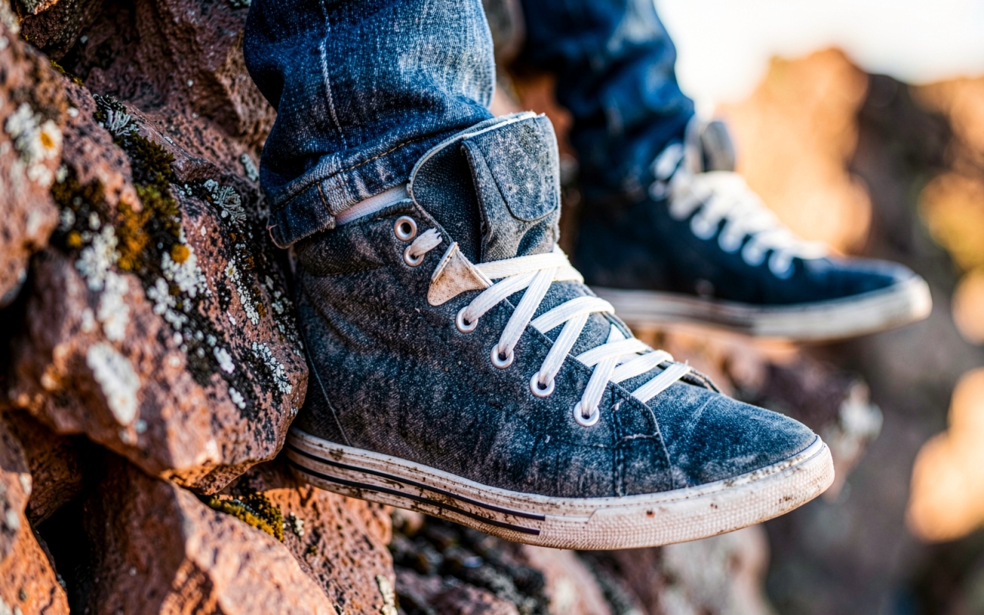 Снимок выполнен с применением малой глубины резкости, что акцентирует внимание на переднем плане и создает мягкое боке в задней части композиции. Синие кеды из плотного канваса имеют характерные потертости и белые шнурки, которые создают яркий цветовой акцент. Освещение соответствует золотому часу, что придает коричневым оттенкам скал теплый тон. Согласно данным color-hex.com, сочетание глубокого синего и терракотового считается классическим комплементарным контрастом в колористике, который привлекает взгляд пользователя.