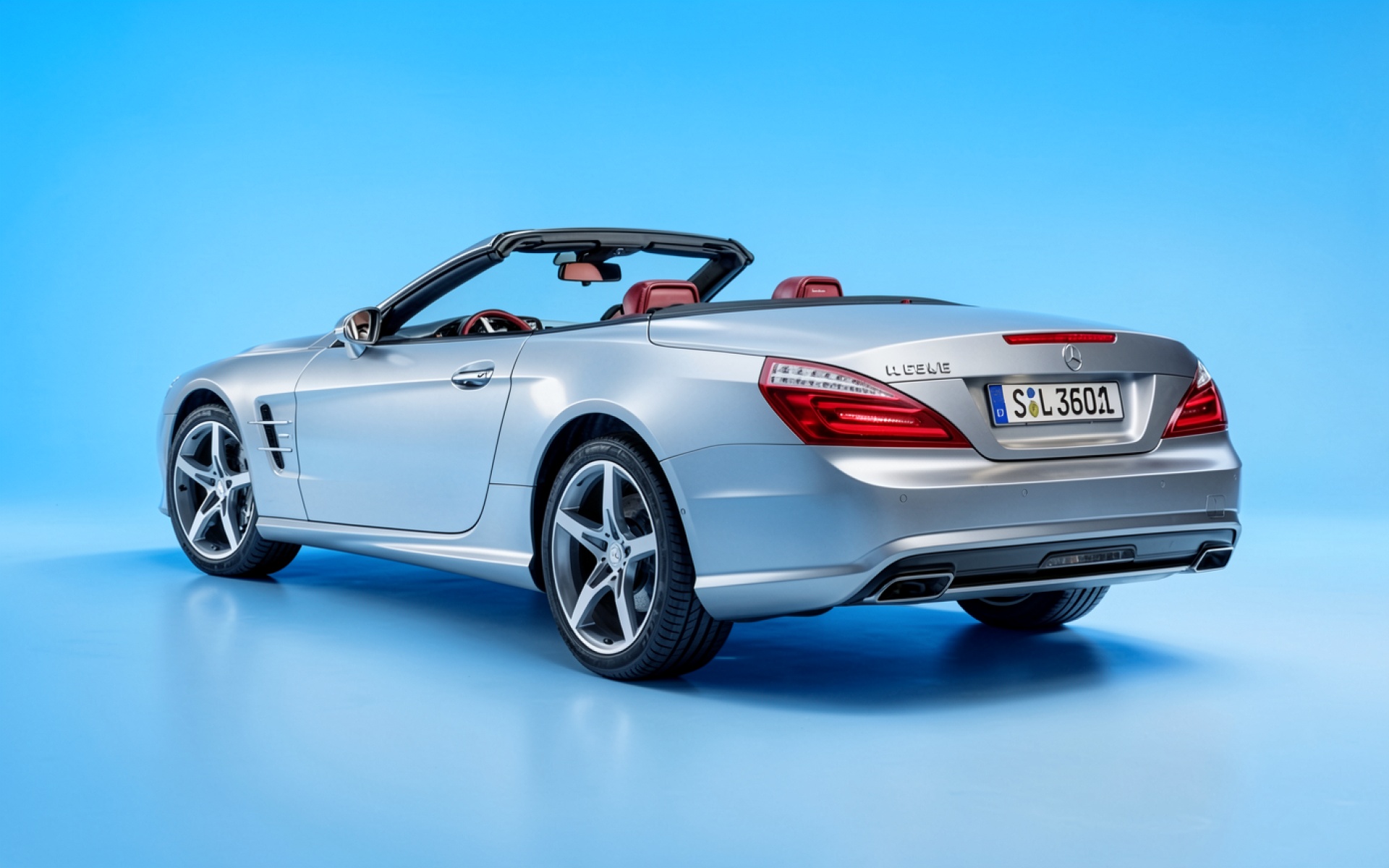 Загрузка JPG обоев Серебристый Mercedes SL кабриолет на голубом фоне с нашего сайта необходима, потому что полная цветопередача сохраняется без потери качества.