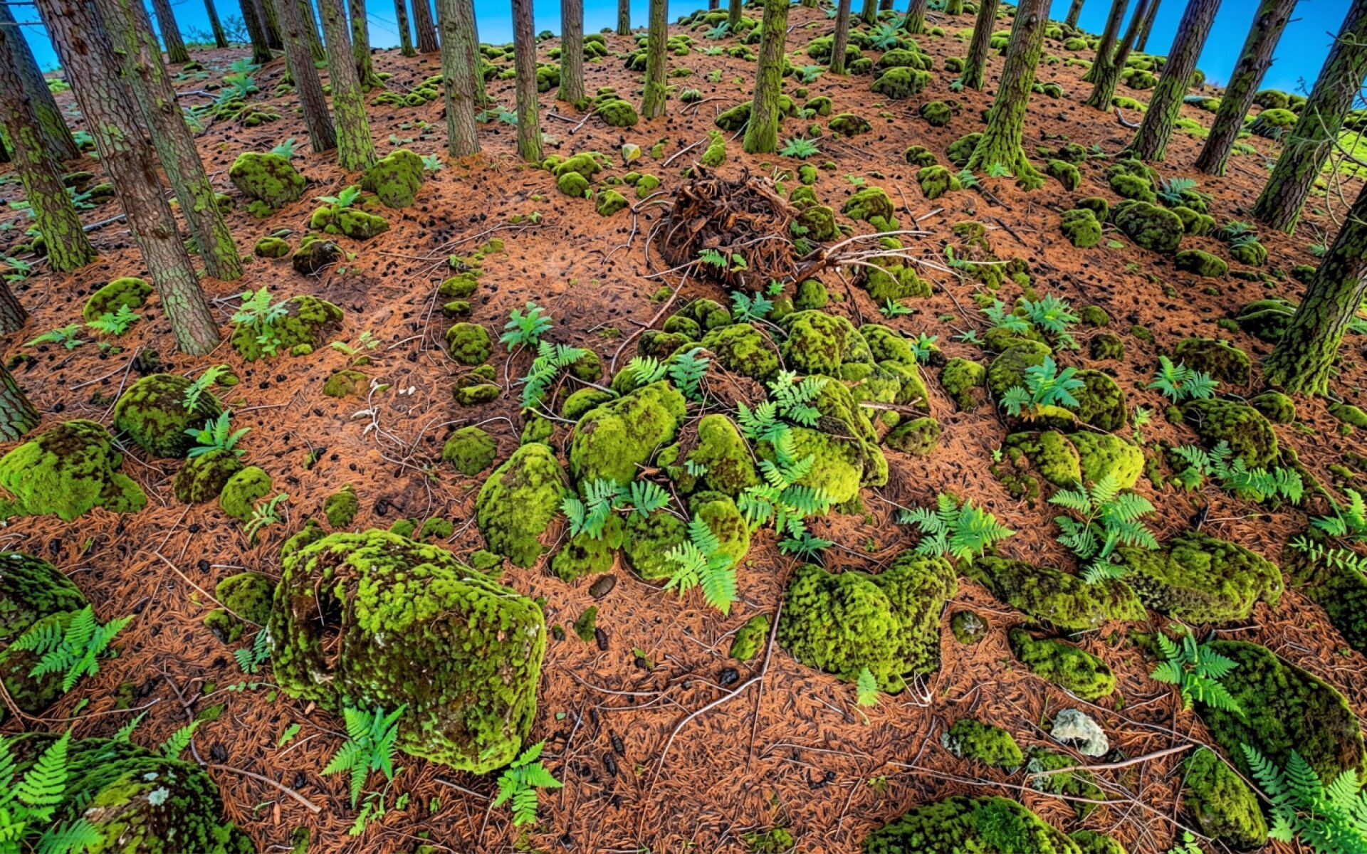 Изображение передает детальную текстуру ворсистого мха и шероховатость гранитных пород. Освещение мягкое, рассеянное, что подчеркивает насыщенные изумрудные оттенки растительности на фоне рыжих сосновых игл. Плавные градиенты теней между стволами деревьев создают объем пространства. На сайте доступен удобный предпросмотр перед скачиванием для оценки качества на экране.