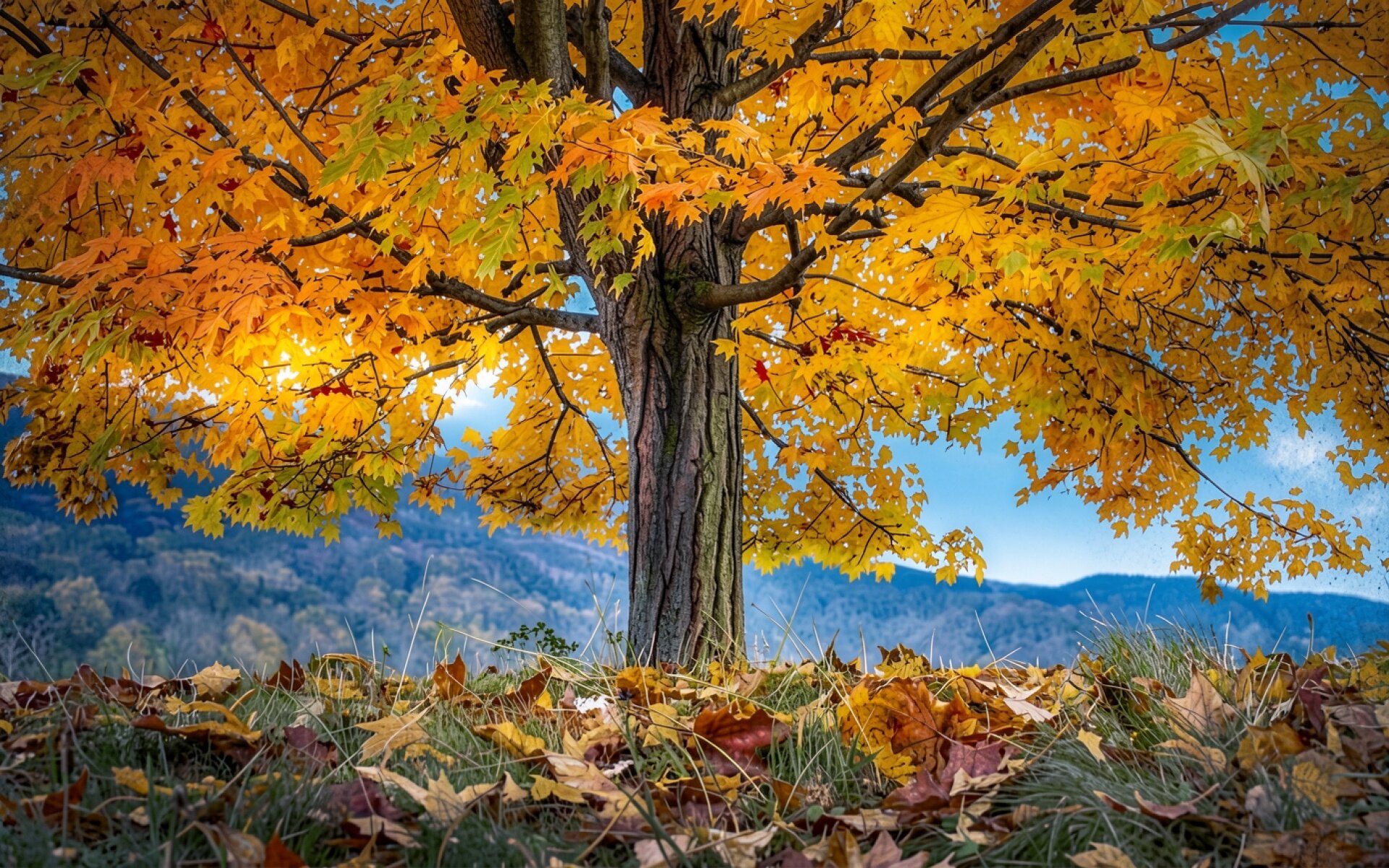 Осенний клен с желтыми листьями в горах обои
