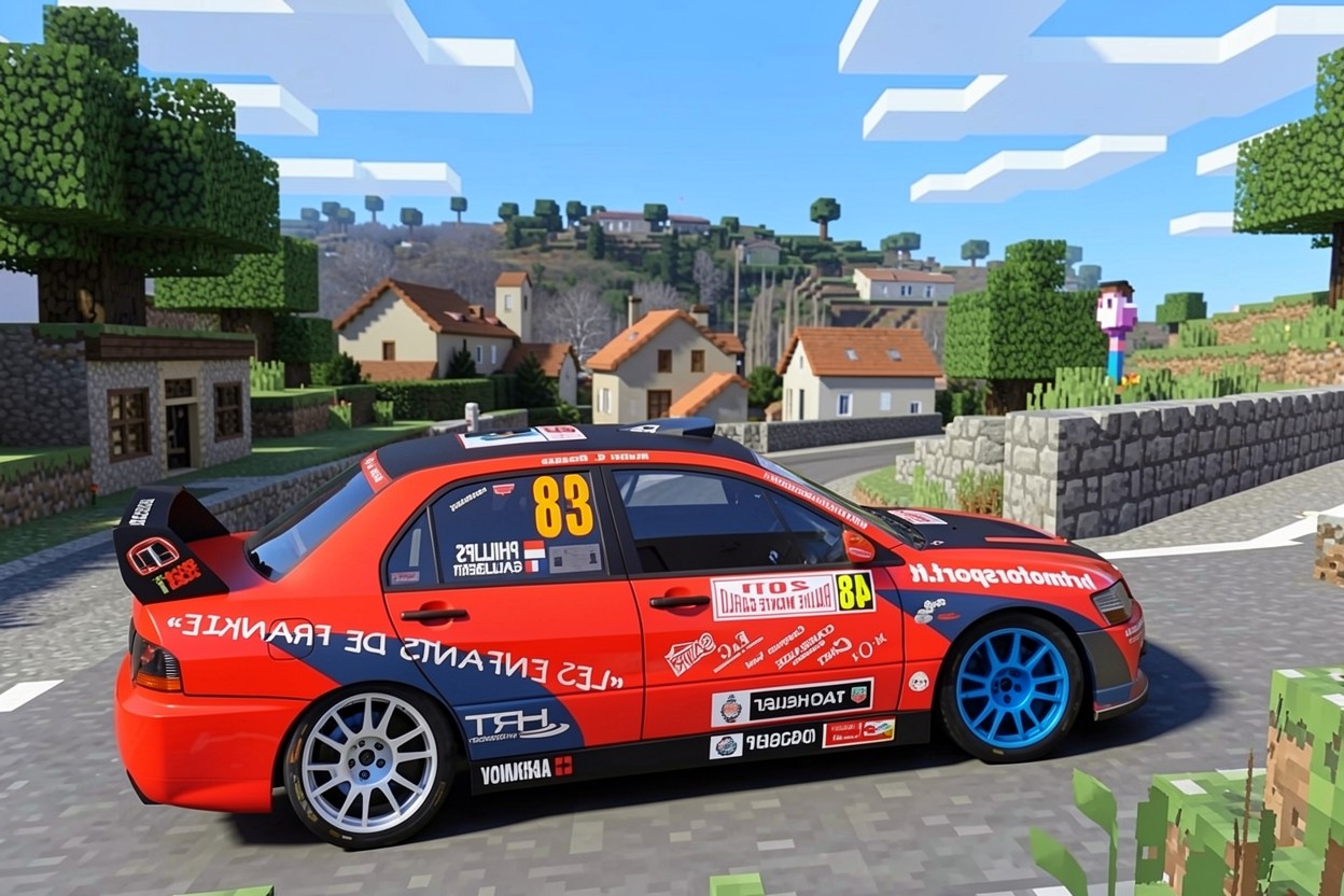 Изображение детально передает глянцевую текстуру кузова с четкими бликами от виртуального солнца. Контрастные тени подчеркивают геометрию автомобиля на фоне блочного ландшафта и градиентного голубого неба. Особое внимание уделено детализации колесных дисков и наклейкам спонсоров, которые сохраняют четкость линий. Сайт предоставляет удобный предпросмотр перед загрузкой для оценки качества отображения на экране.