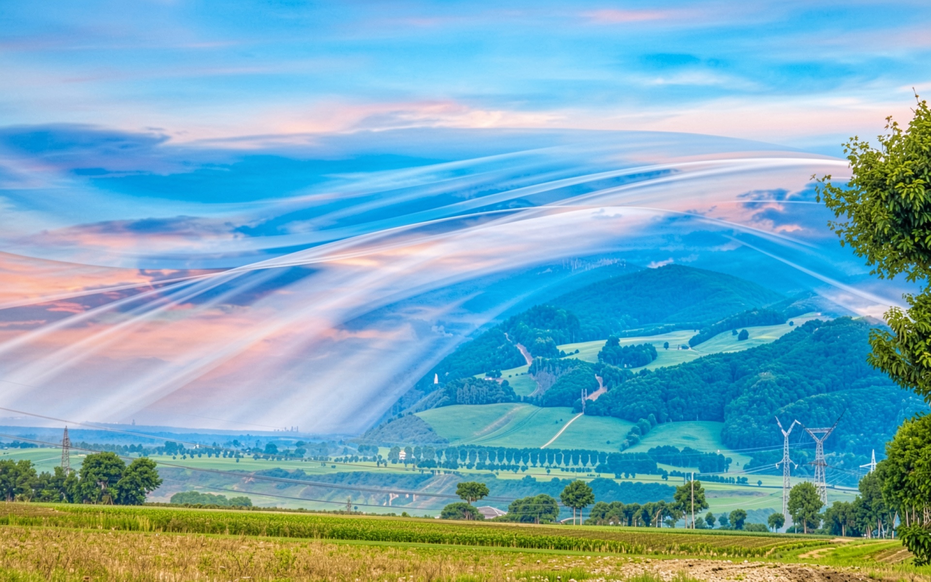 Загрузка JPG обоев Сюрреалистичный пейзаж с голубыми холмами и облаками с нашего сайта необходима, так как полная цветопередача сохраняется без потери качества.