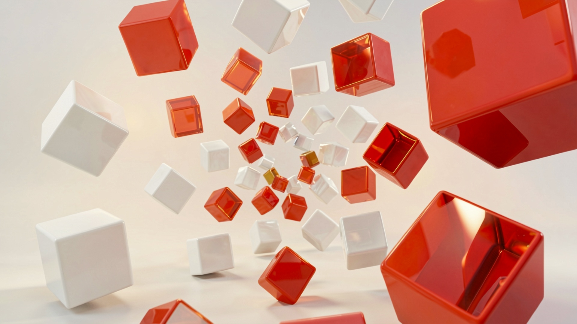 Изображение характеризуется высокой детализацией отражающих поверхностей объектов. Глянцевая текстура создает четкие блики и глубокие тени, которые подчеркивают объем каждой фигуры. Плавные переходы света на белых гранях контрастируют с насыщенным красным цветом, создавая динамичную композицию в нейтральном окружении. На сайте предусмотрен удобный предпросмотр перед загрузкой для оценки качества отображения на экране.