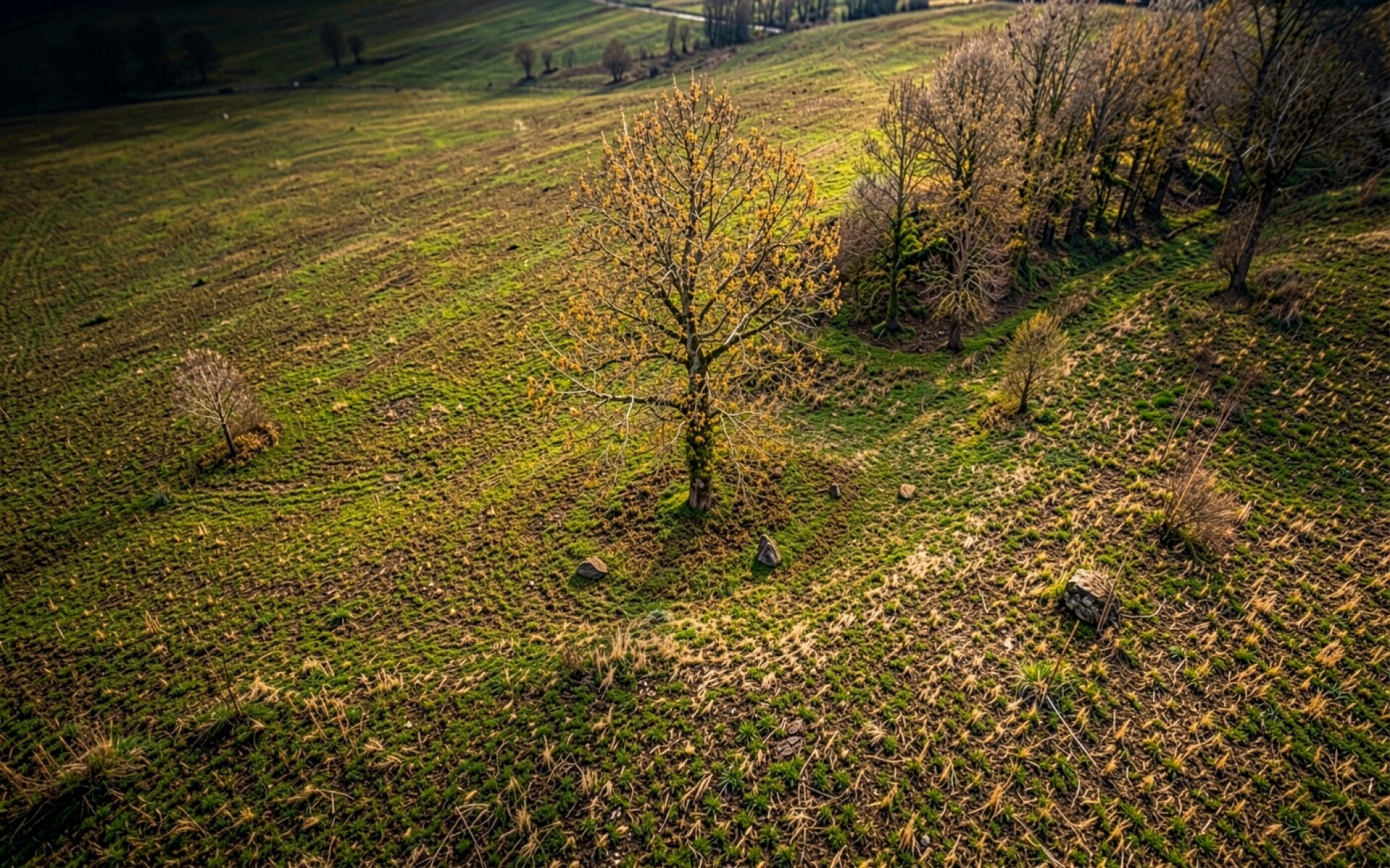 Одинокое дерево с желтой листвой на осеннем лугу обои