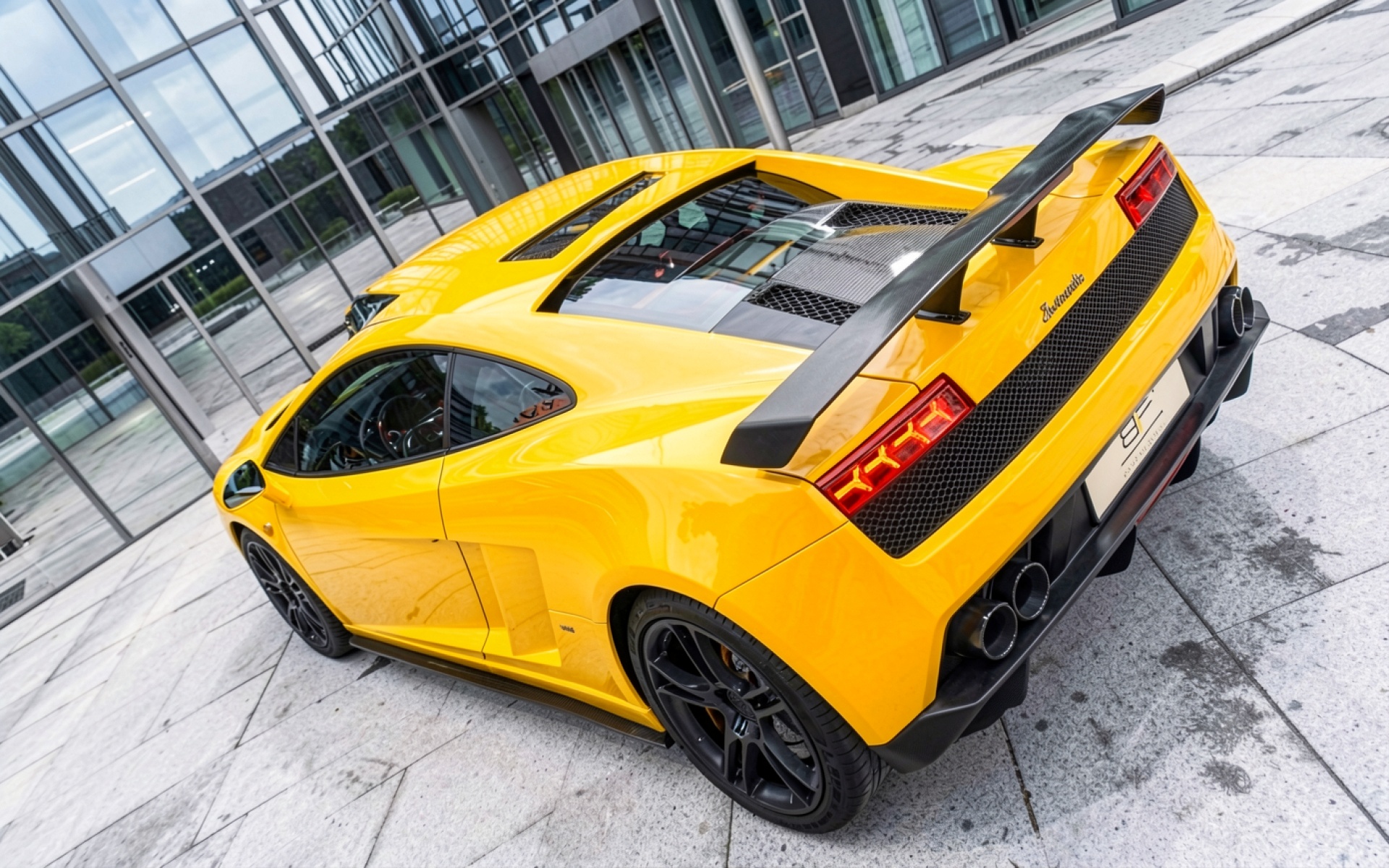 Загрузка JPG обоев Желтый суперкар Lamborghini на фоне современного здания с нашего сайта необходима, так как только этот JPG сохраняет метаданные цветокоррекции.